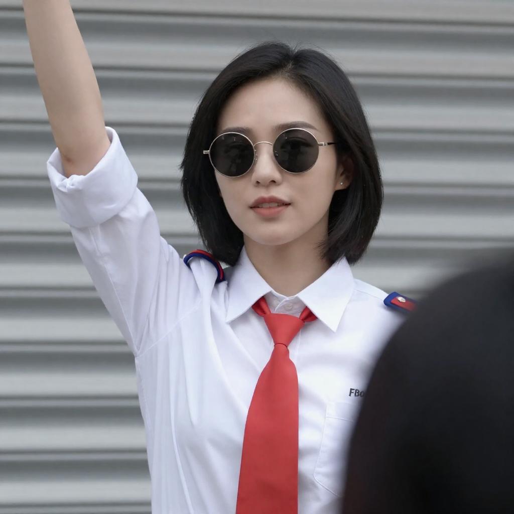 Asian woman with short black hair wearing round reflective sunglasses, white uniform with red tie and striped shoulder epaulettes. Background includes closed metal roller door and neon light. She looks surprised, mouth slightly open. Upper body focus.