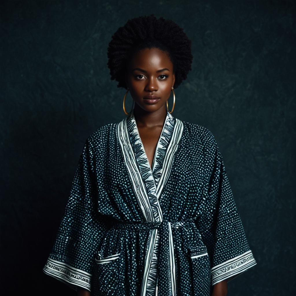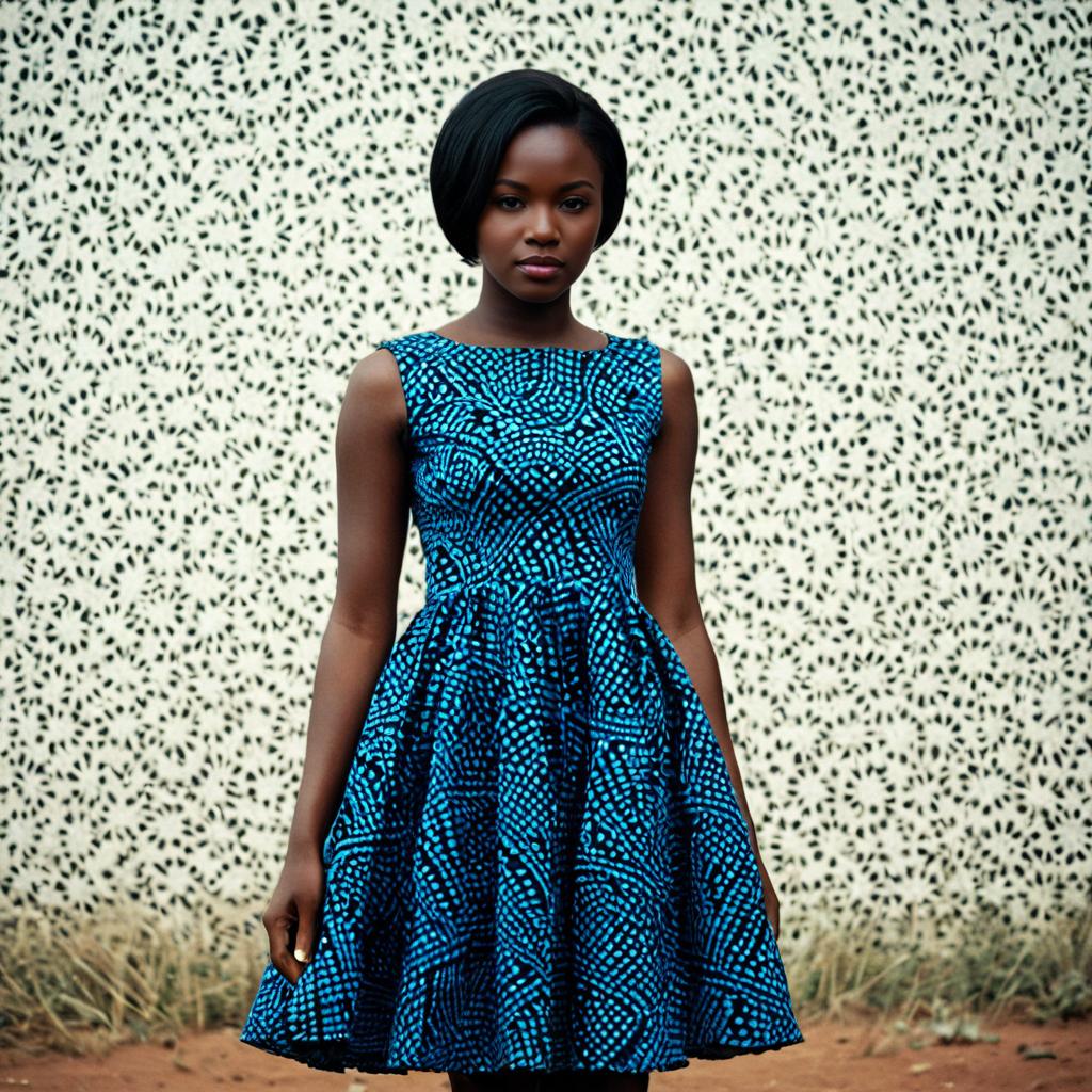 Ankara chitenge dress,1girl, solo, dress, black hair, short hair, blue dress, sleeveless, standing, sleeveless dress
