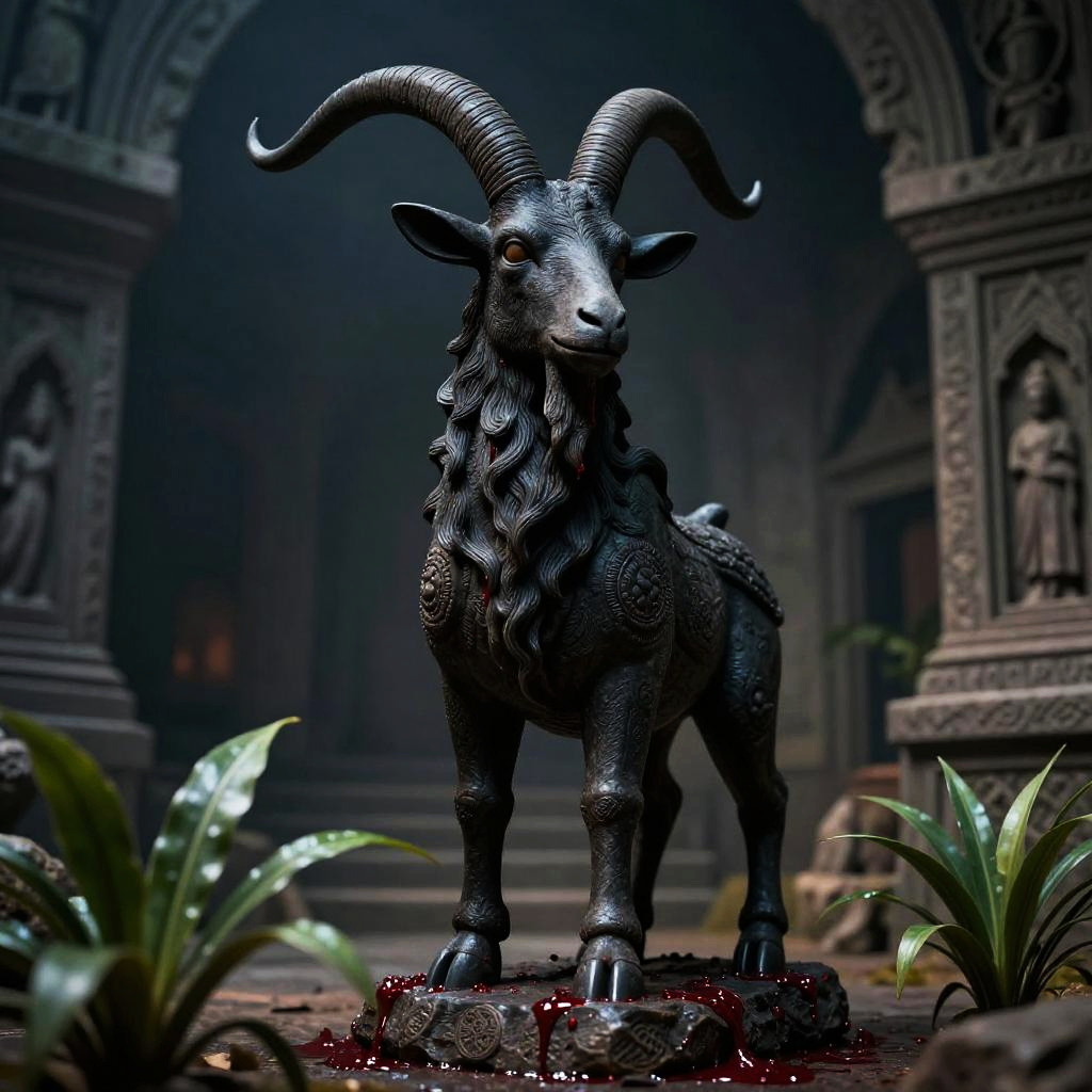 Award winning photo, masterpiece, best quality, evil (black stone goatman statue:1.3), Style-Cupola, Style-LostTemple, in deep (fore BREAK 1.5), baphomet, sinister, evil, blood, plants in foreground, shallow depth of field by lee jeffries nikon d850 film stock photograph 4 kodak portra 400 camera f1.6 lens rich colors hyper realistic lifelike texture dramatic lighting unreal engine trending on artstation cinestill 80