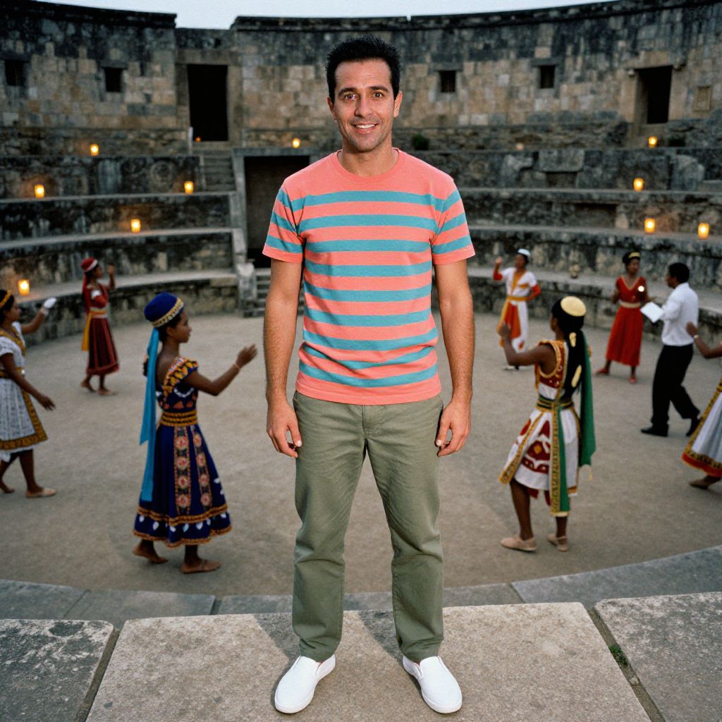 Vibrant, inverted hues illuminate the aged facades of colonial buildings, as the sun dips into the Caribbean Sea, casting long shadows across the cobblestone streets of Old San Juan. A man in a crisp white shirt, with a worn fedora hat, pauses at an ornate doorway, lost in thought, amidst the rich history and cultural Man has masculine face and piercing eyes