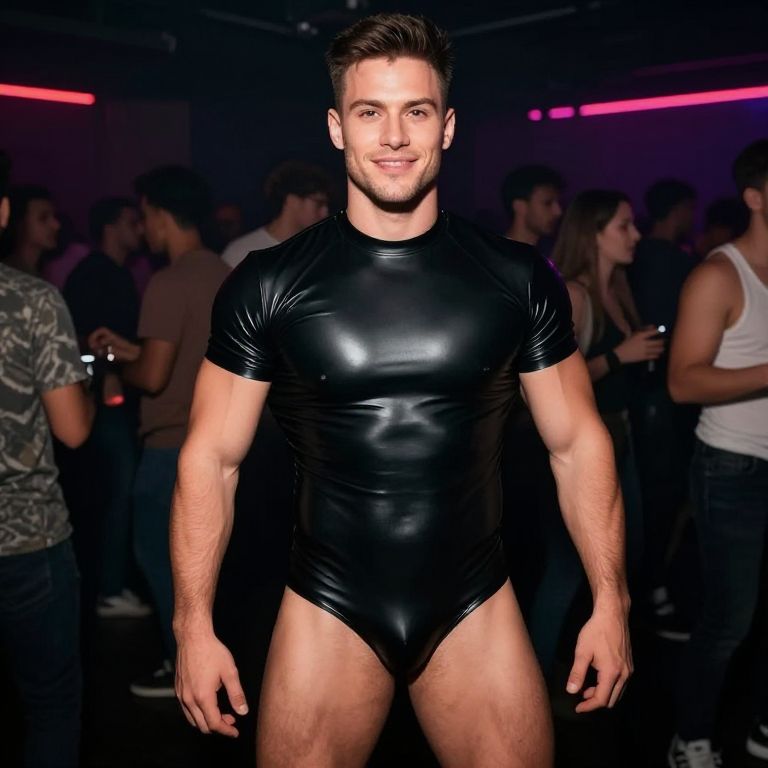 Impressionist muscular guy at a club wearing skintight pvc shirt, friendly, fun, short brown hair, full body,