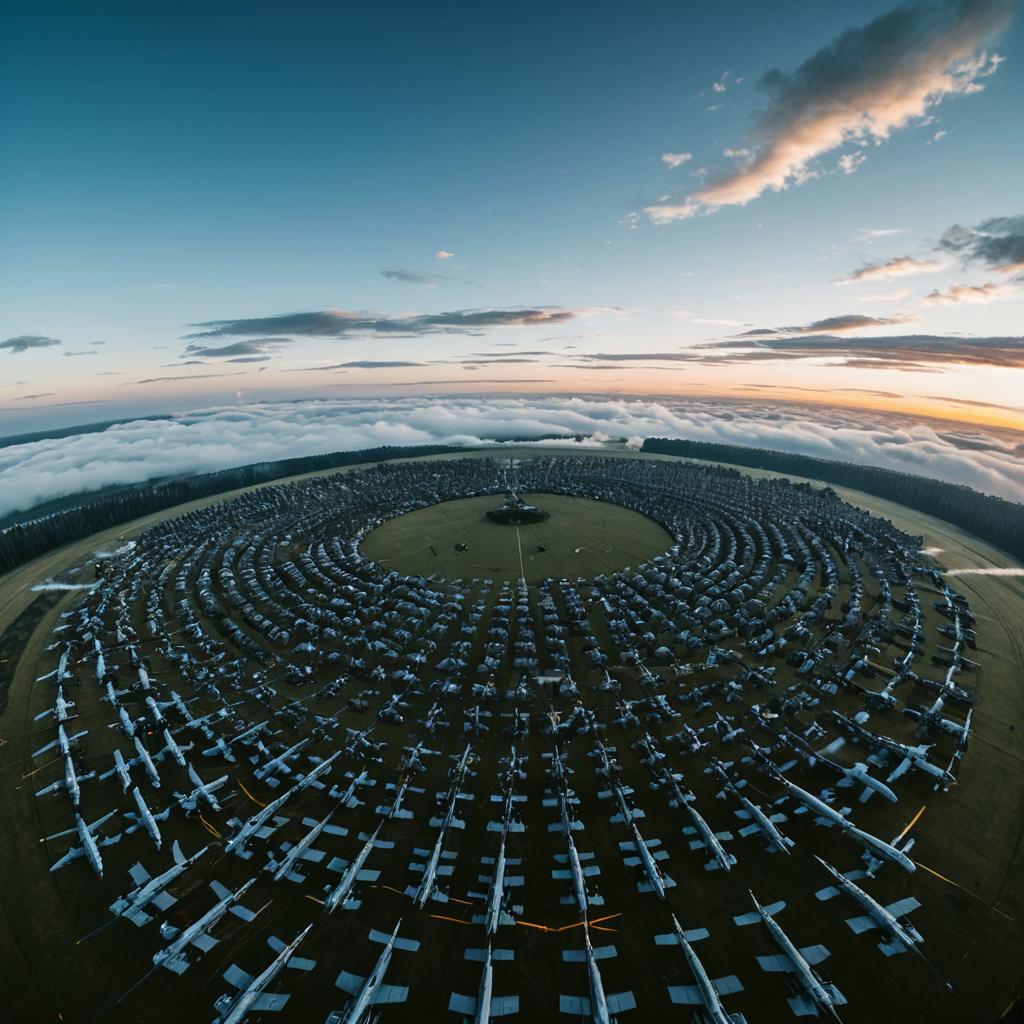 Floating island, shot with a fish-eye lens from a height of 60 meters. Clear image. 4k, the plain in the foreground. large number of sky hunters. The screen is distorted by the curvature of the lens. Fighting is happening everywhere. The armies line up and face each other. drone shots of armies beyond the horizon. cloudscape at dawn, with clouds and rising smoke.