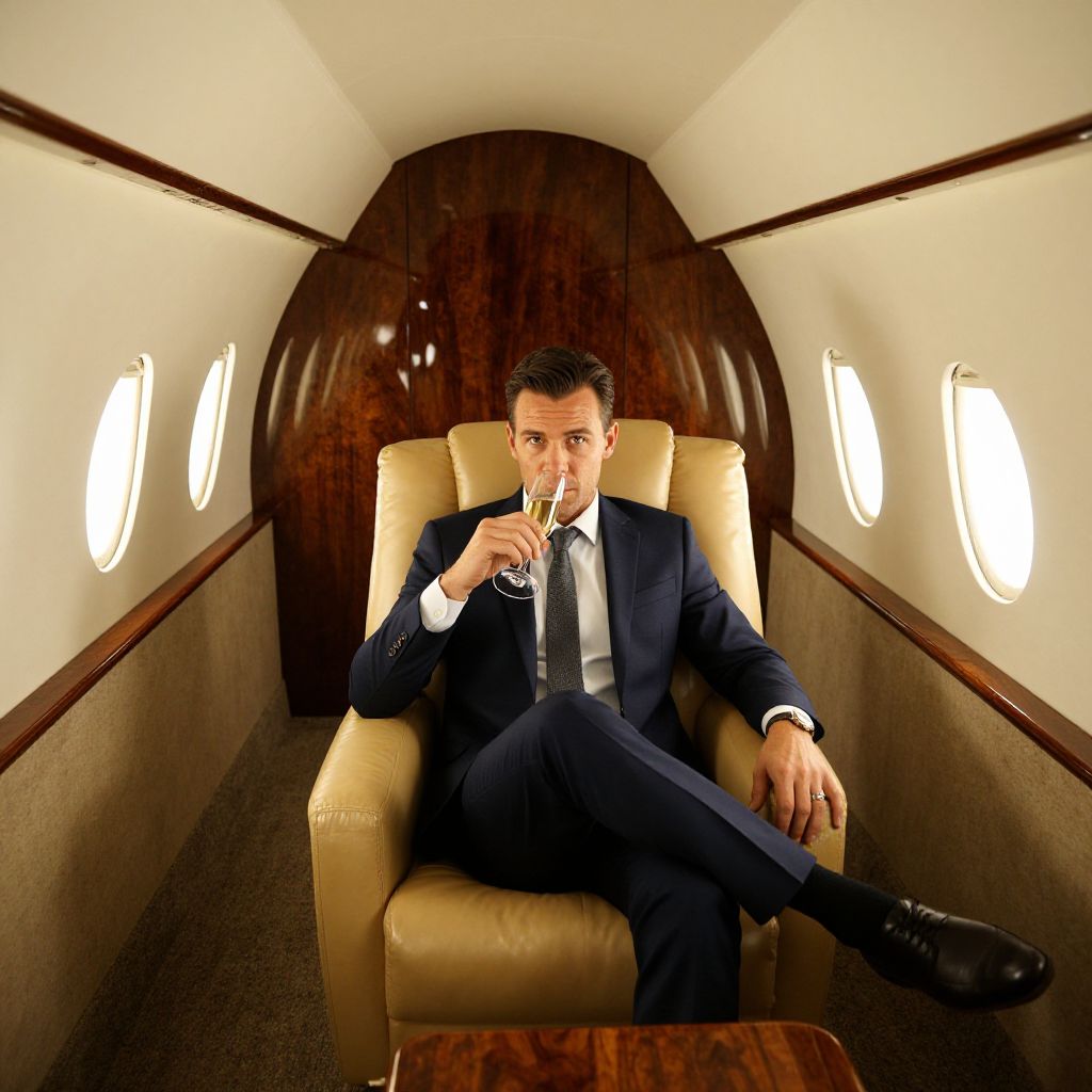 Photograph of a man with short dark hair, wearing a navy blue suit, white shirt, and black tie, sitting in a beige leather armchair inside a private jet. He is holding a glass of champagne in his right hand and has his left arm resting on the armchair. The background features wooden paneling and four illuminated oval windows. The man's expression is confident, and the carpet is dark gray with a textured pattern. The lighting is bright, highlighting the luxury and comfort of the interior.