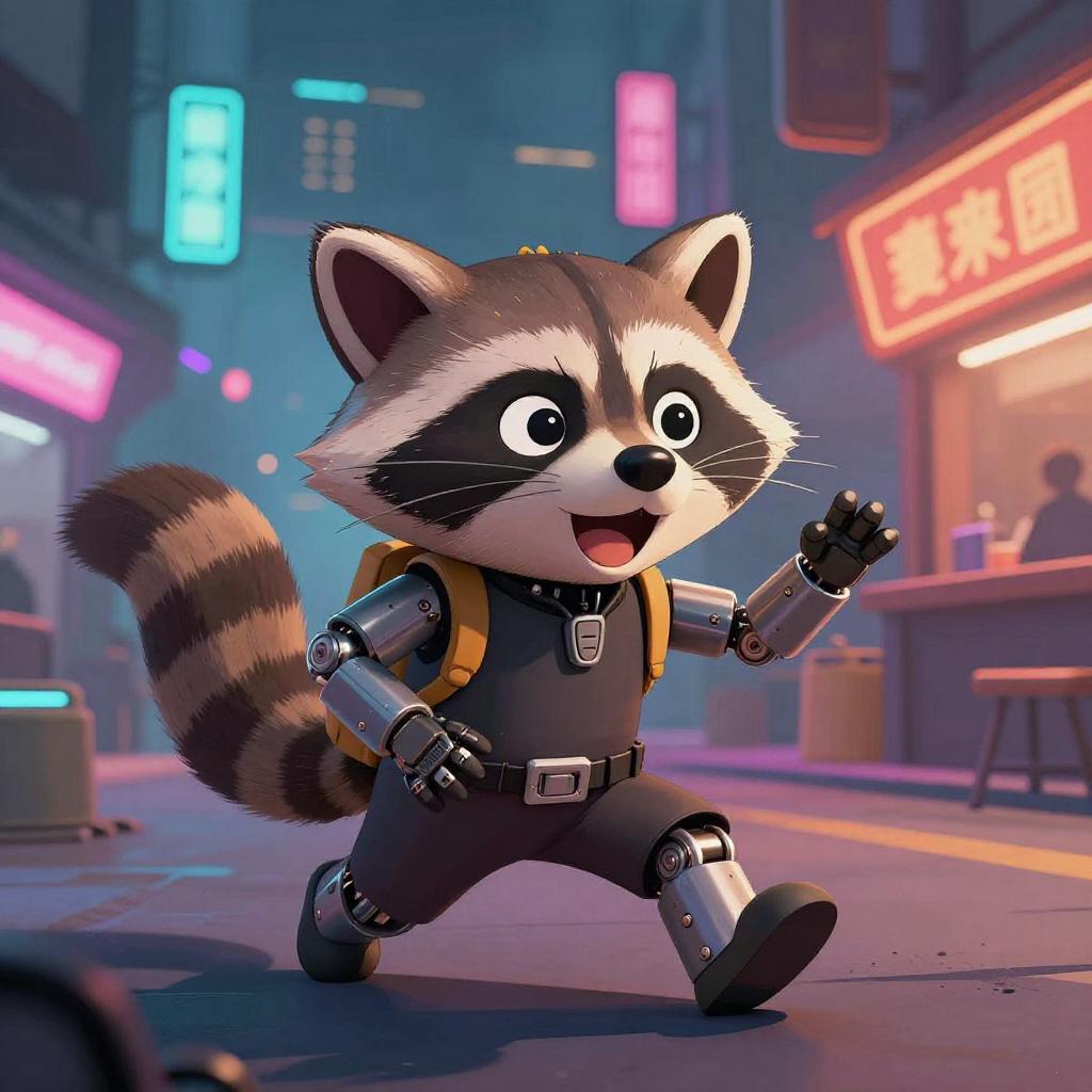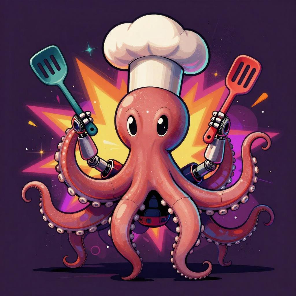 A playful caricature of robotic chef octopus juggling colorful kitchen utensils rendered in dynamic digital graffiti with sharp neon contrasts, capturing comic energy and creative flair.