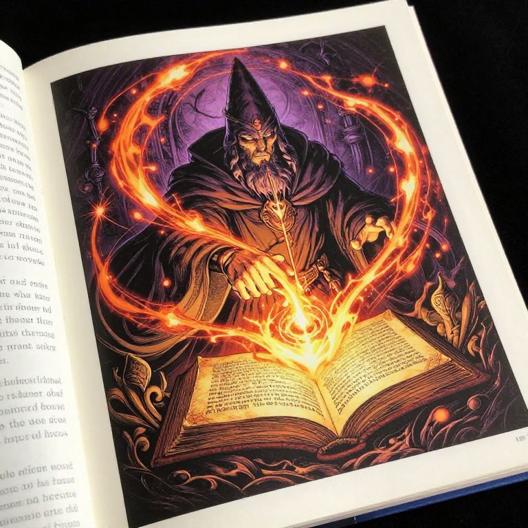 Photograph of an open book with a vivid, digital illustration on its right page. The illustration depicts a wizard with a long, flowing beard and pointed hat, surrounded by swirling, fiery orange and red magical energy. He is casting a spell over an open, glowing book with ancient text. The background is dark purple, enhancing the brightness of the flames and the wizard's dark robes. Text on the left page of the book is visible, printed in white. The book is placed on a black surface, contrasting with the bright, colorful illustration.