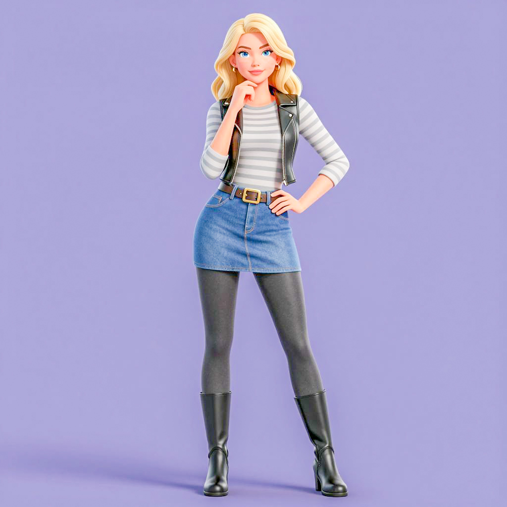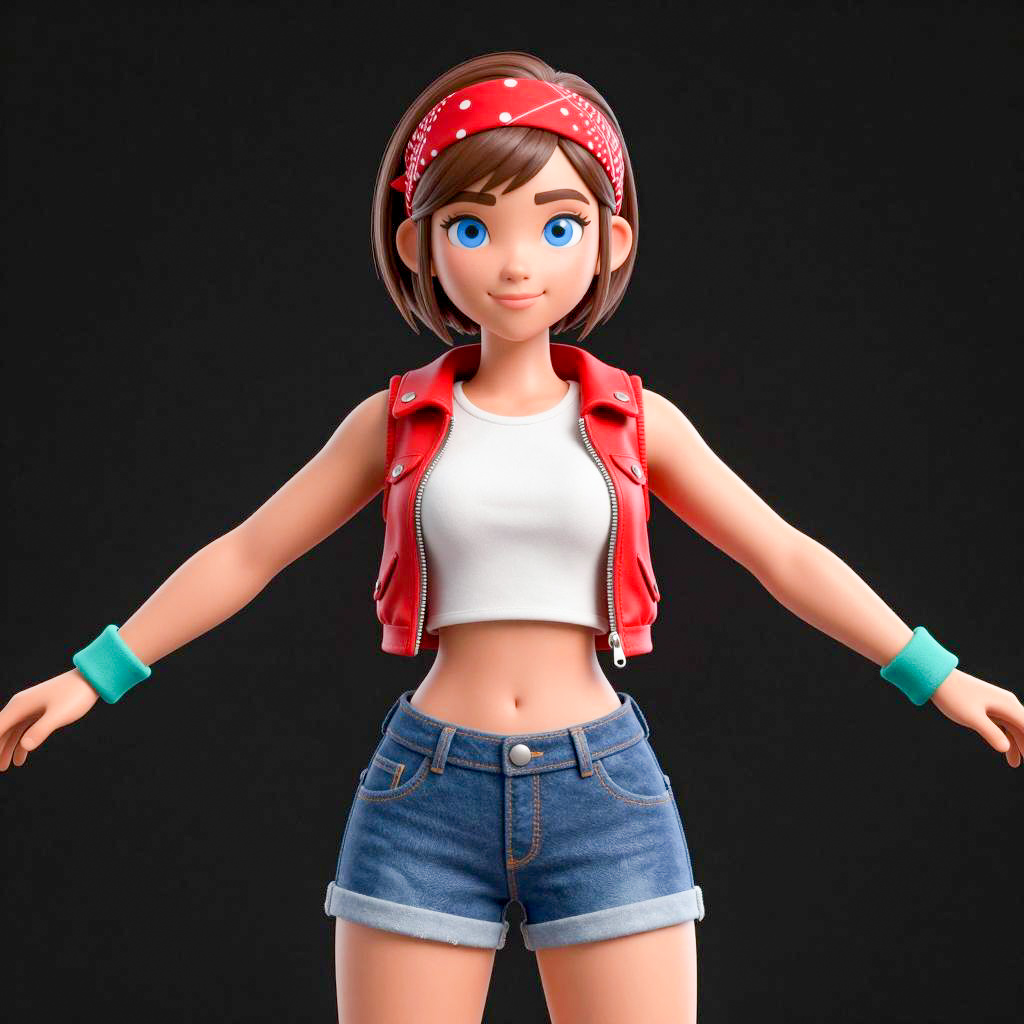 3D digital rendering of a young woman with short brown hair, blue eyes, and a red and white bandana. She wears a white crop top, red sleeveless jacket, blue denim shorts, and teal wristbands. Her arms are outstretched to her sides. She has a slight smile. Black background. She stands with legs slightly apart.