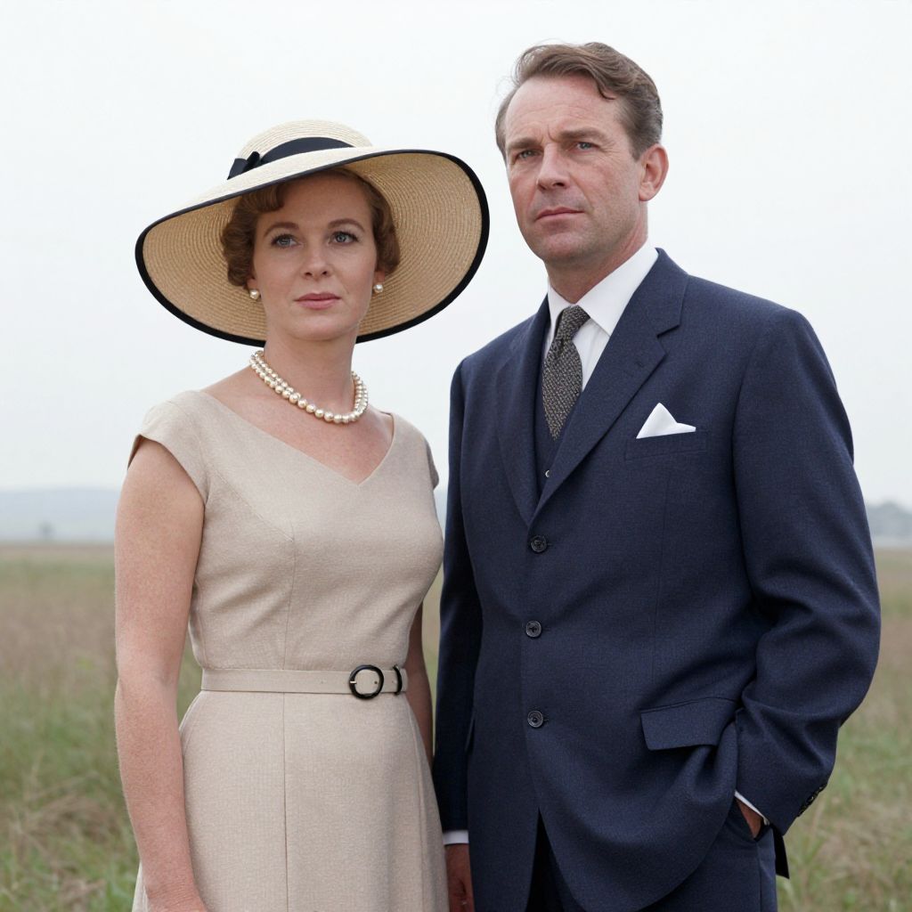 Elegantly dressed couple standing side by side in a serene field, the woman wearing a wide-brimmed hat and pearl necklace, while the man dons a sharp suit with a crisp white pocket square, evoking a classic 1960s aesthetic reminiscent of \"Bonnie and Clyde.\