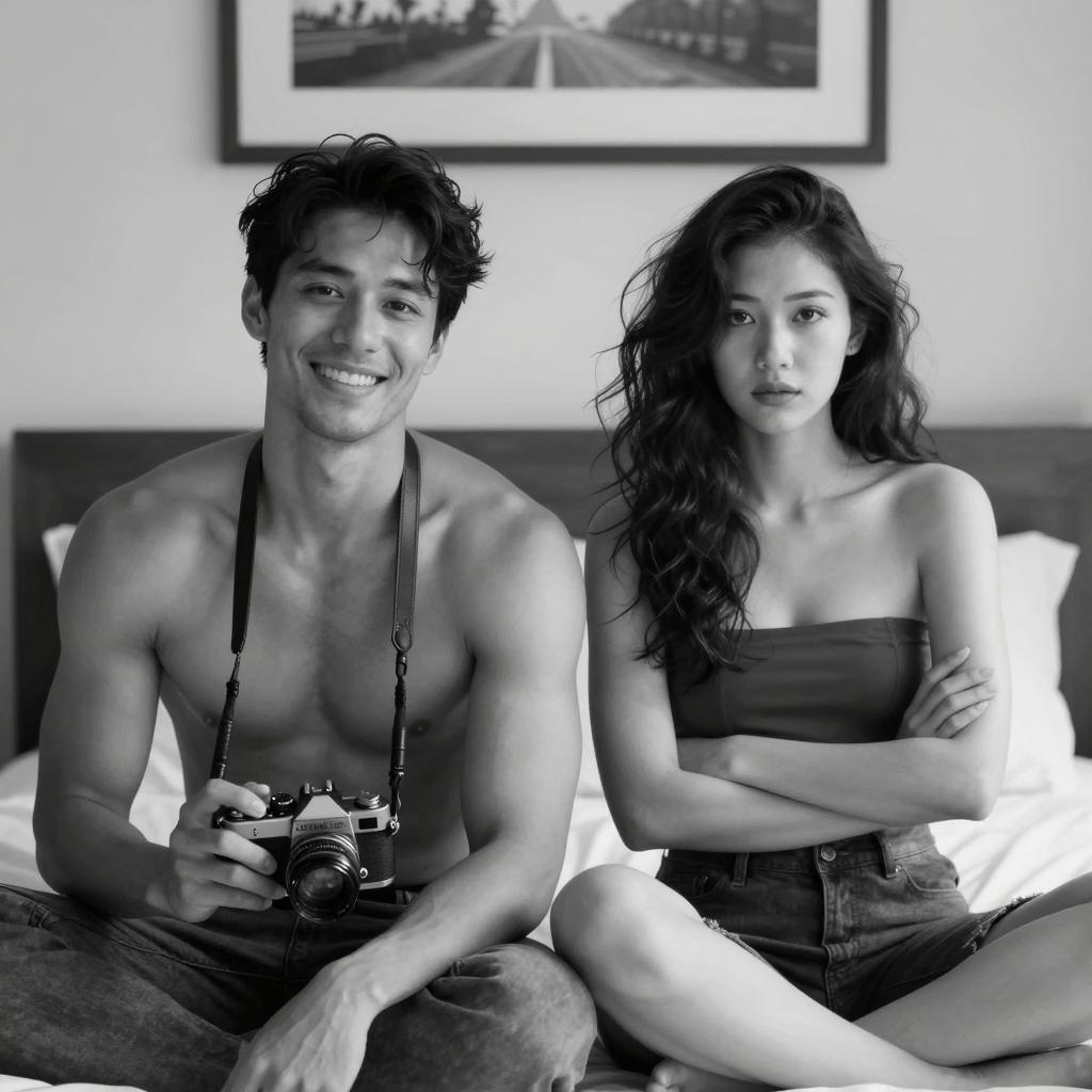 Two people sitting in wooden chairs against a dark background. The man on the right is shirtless, wearing a white towel, with a necklace, and slightly leaning back. The woman on the left wears a white robe, with dark hair, looking to the side. Warm light from a lamp on the left side illuminates the scene.