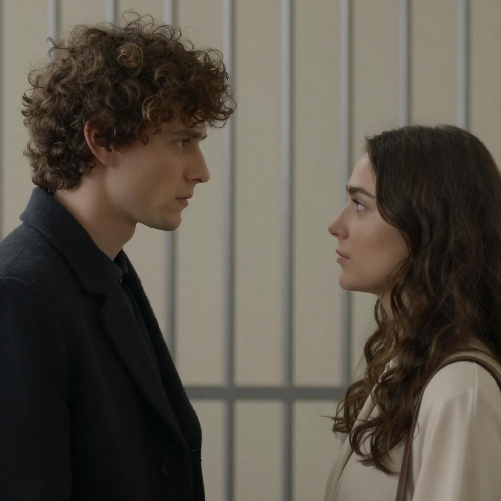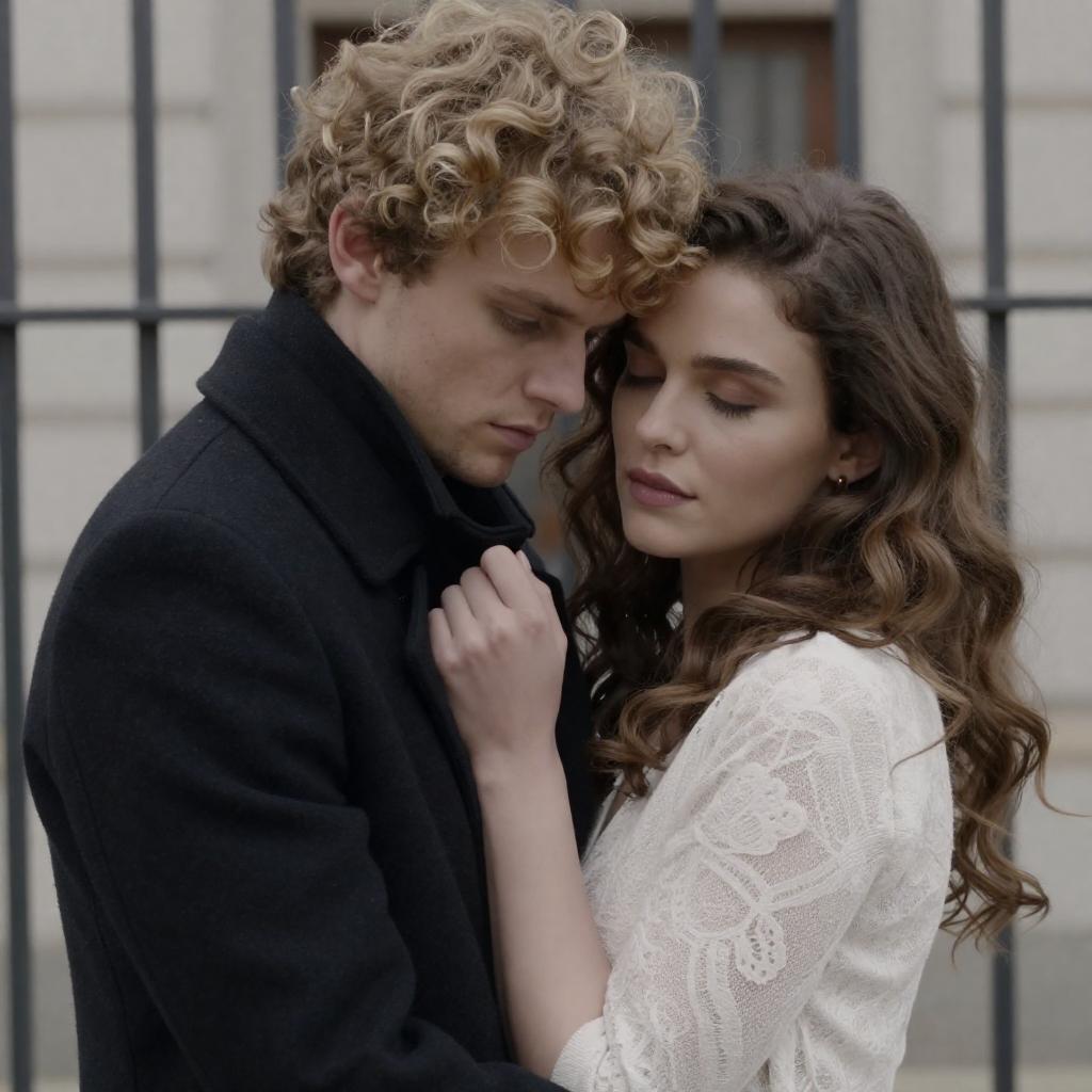 Photograph of a man and woman in a close, intimate pose. Man with curly brown hair, light skin, black coat, brown scarf, side profile. Woman with light brown wavy hair, light skin, closed eyes, soft expression, gray dress. They face each other, nearly touching noses. Background includes blurred metal bars.
