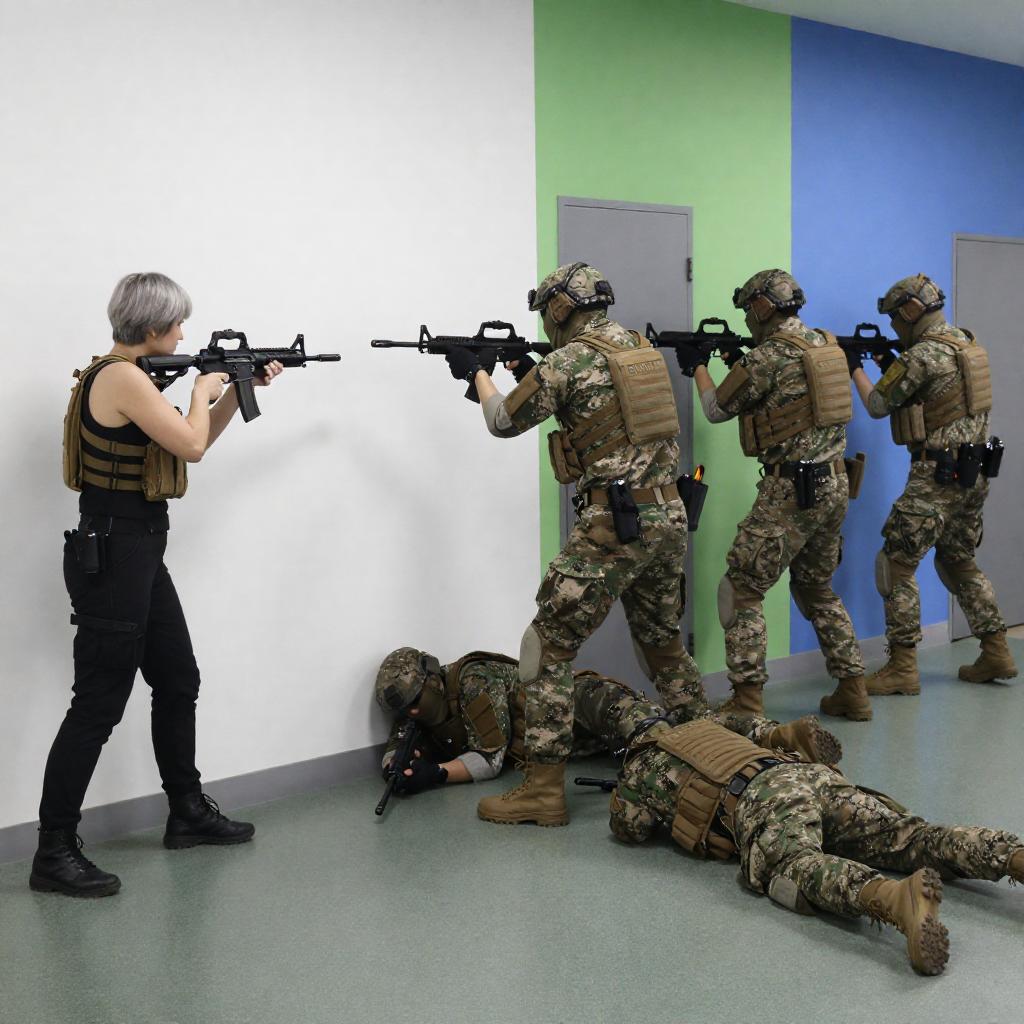 Indoor tactical training scene showing a female participant with short gray hair wearing a black tank top, black tactical pants, and a tan vest aiming a rifle. She faces five camo-clad soldiers in full combat gear including helmets, tactical vests, and knee pads, who are armed with rifles and engaging in a simulated shootout. The background features white, green, and blue walls with a green floor and metal doors, suggesting a training facility environment.