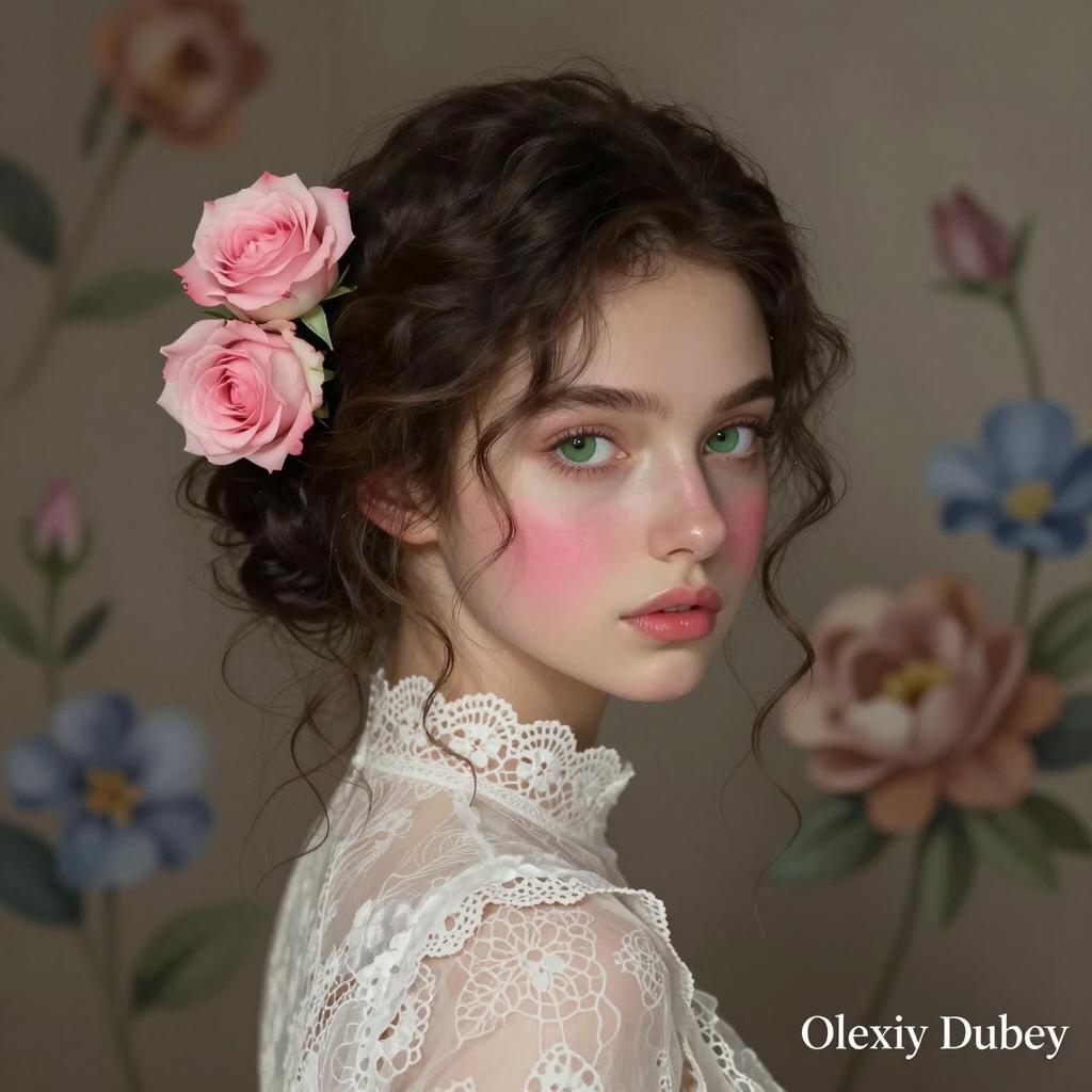 Digital illustration of a young woman with fair skin, dark wavy hair in an updo with pink roses, wearing a white lace collar and dress. She looks over her shoulder with intense, green eyes, pink blush on her cheeks. Floral background with brown and blue flowers. Artist's "Olexiy Dubey" in bottom right corner.