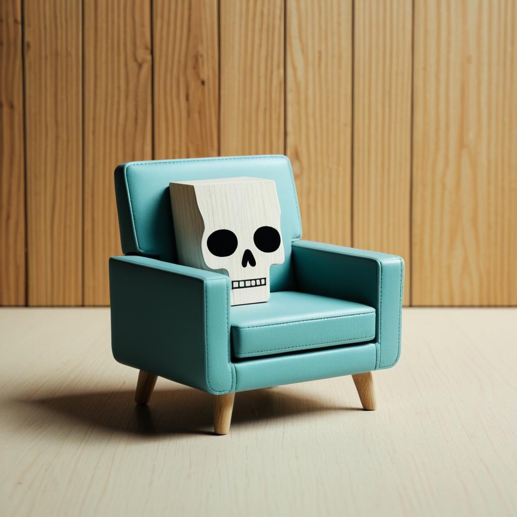 A small chair with an artistic design featuring luminous acidic colors including teal and light green. The chair has a modern, minimalist aesthetic inspired by industrial design principles. It is set against a dark textured wooden background, emphasizing the vivid colors and sharp details. The chair's design reflects influences from Mark Ryden's style and Dieter Rams' functional approach, captured in high detail and 4k resolution.