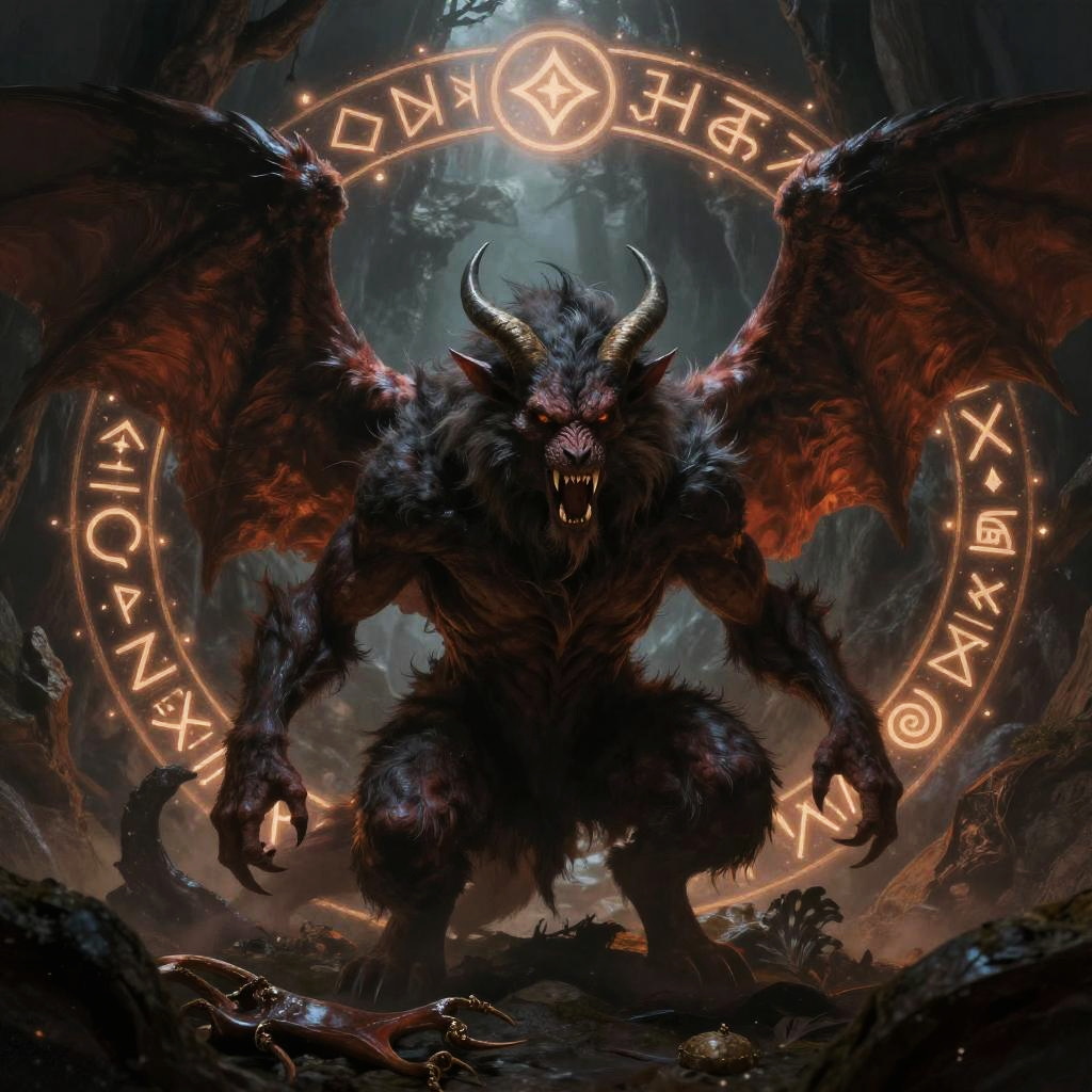 Furry demon with large wings and sharp fangs, covered in dark matted fur, crouching in a shadowy cave, mystical runes glowing around, hyper-detailed fantasy painting