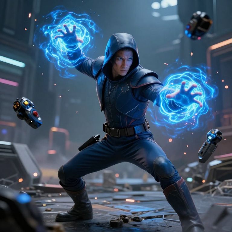 Telek in a battle stance, controlling multiple objects with telekinesis simultaneously, futuristic battlefield with blurred motion effects and sparks flying, vibrant blue psychic aura surrounding hands, intense expression illustrating mastery of mental powers in a sci-fi setting.