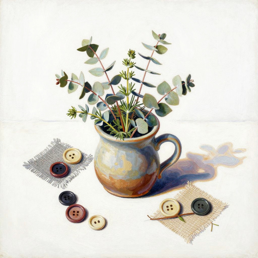 Whimsical still life rendered as a cyanotype blueprint. At the center, a ceramic bowl with fresh lemons anchors the composition. Scattered around are small jars, marbles, dried flowers, arranged playfully while keeping a clean backdrop, lively textures, soft cast shadows, balanced layout, charming details, handcrafted feel, and an inviting mood.