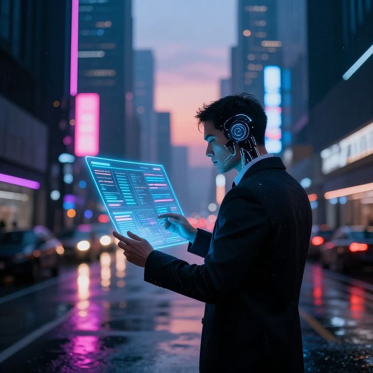 Hot prompt: A futuristic cyberpunk city at dusk, neon lights glimmering over rain-soaked streets, a lone figure in a smart suit analyzing data on a holographic interface, immersive cybernetic details, high dynamic contrast, sci-fi atmosphere, cinematic lighting.