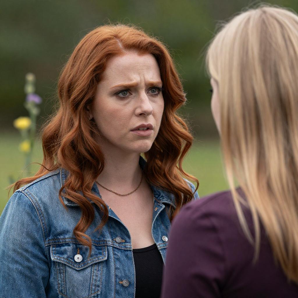 Two women standing outdoors at night, smiling. Woman on left has long brown hair, colorful floral off-shoulder dress, fair skin. Woman on right has red hair in an updo, black jacket, green patterned top, fair skin. Background includes stairs and building. Both women looking slightly to the left. Warm lighting.