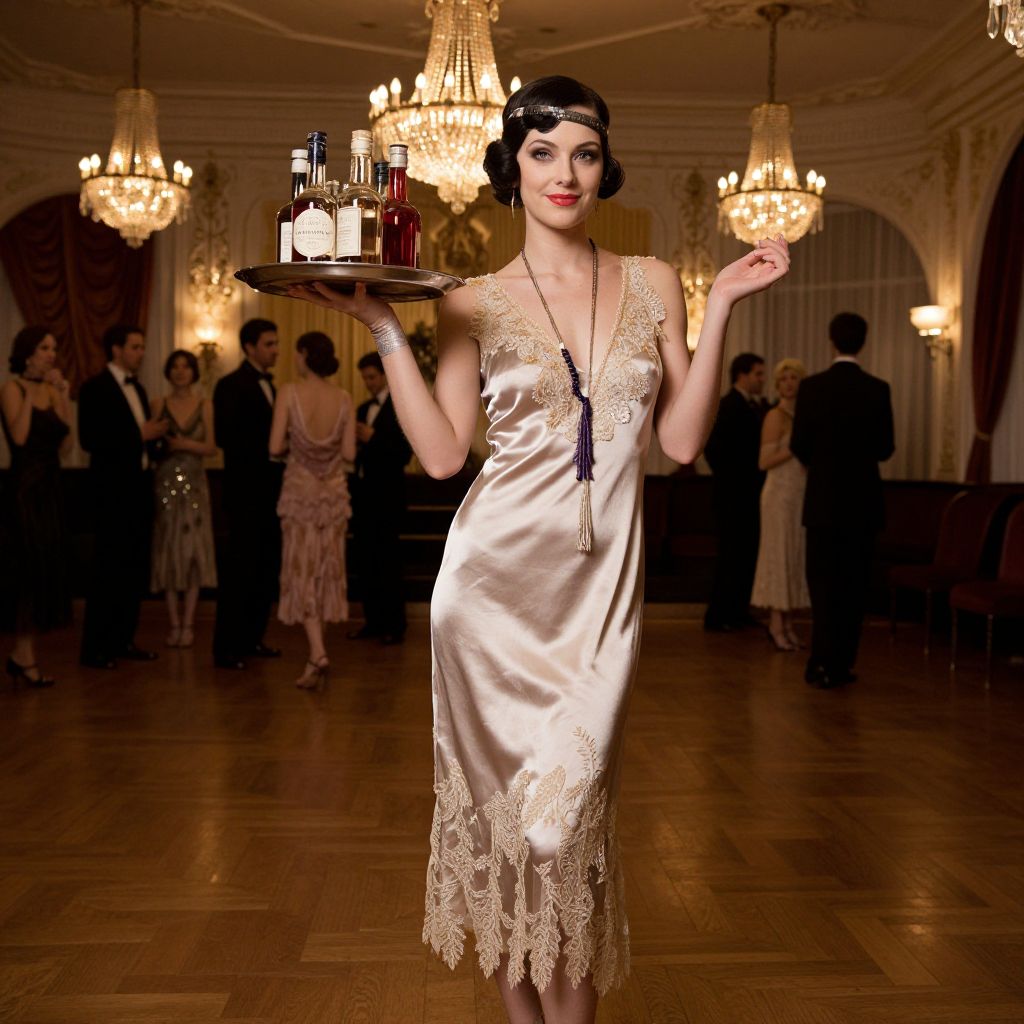 Vintage-style photograph of a flapper woman in a lace-trimmed, cream satin dress, holding a tray with drinks, in an elegant, ch