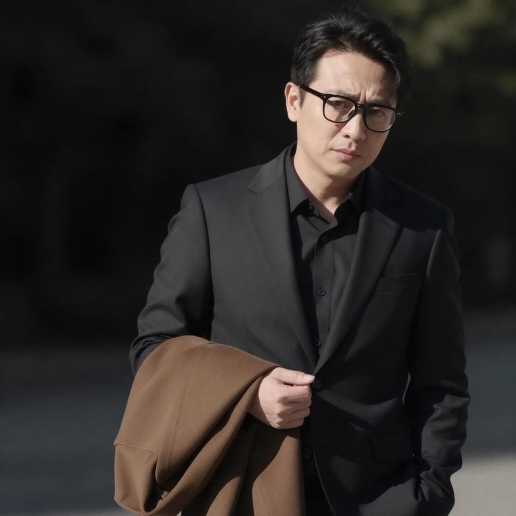 Photograph of a man with dark hair, glasses, and a black suit, holding a brown coat over his lap. He is illuminated by a bright light source, creating strong shadows. The background is dark with indistinct greenery. His expression is serious, and he is slightly tilted to the right.
