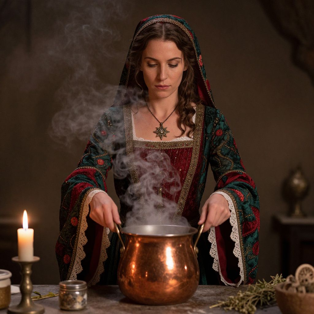 Photograph of a dark-haired woman in a medieval-style, dark red and green embroidered dress with a matching headscarf, standing in a dimly lit room. She is stirring a copper pot emitting steam, positioned centrally on a wooden table. A lit candle on the left and a small glass jar on the right are on the table. The background is dark, with indistinct, shadowy objects. She wears a black necklace with a star-shaped pendant. Her focused expression and the warm, ambient light create a rustic, historical atmosphere.