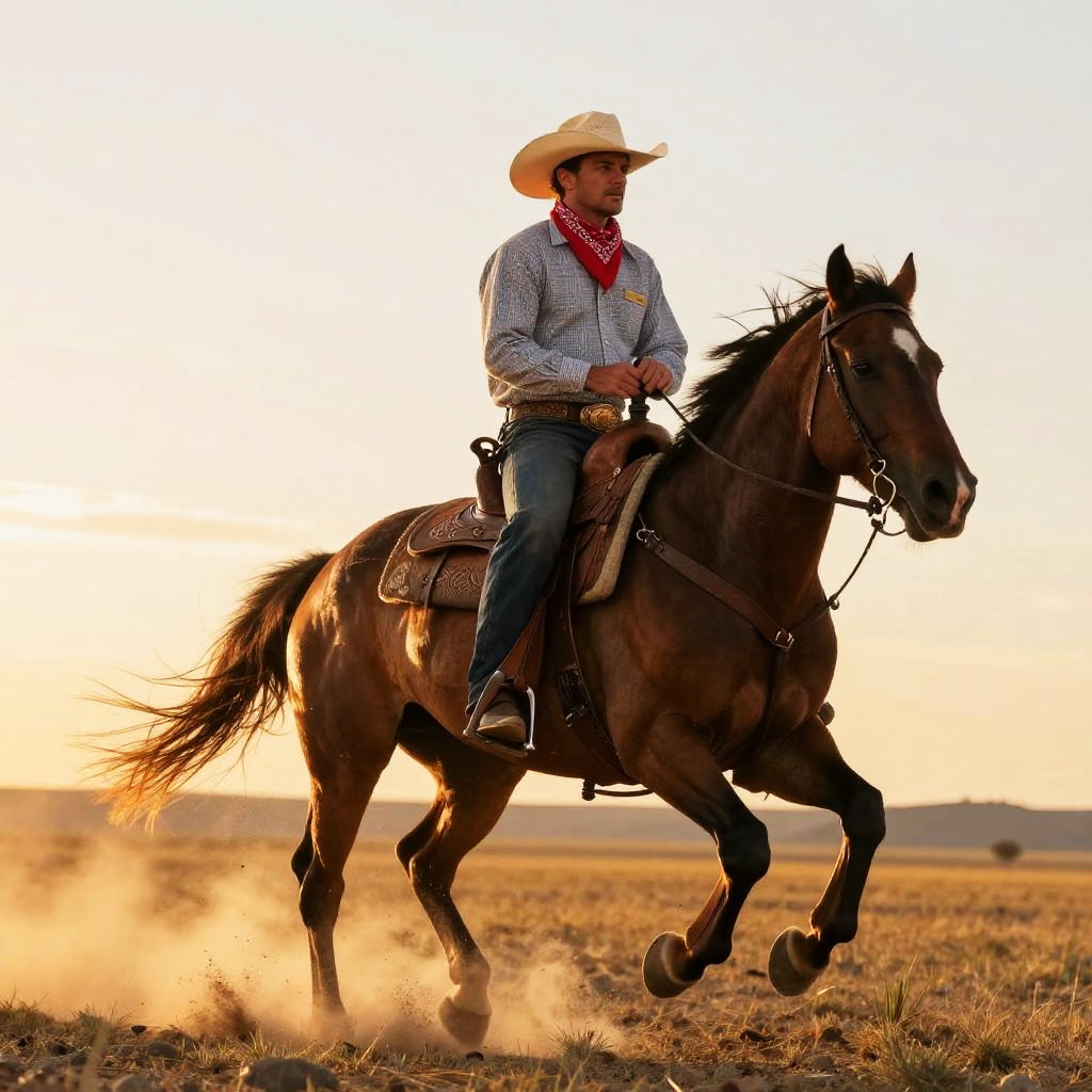 Handsome cowboy riding a galloping horse across open plains at sunset, dust swirling in the golden light, classic western attire with a red bandana and holster, dynamic action shot, vivid colors, highly detailed