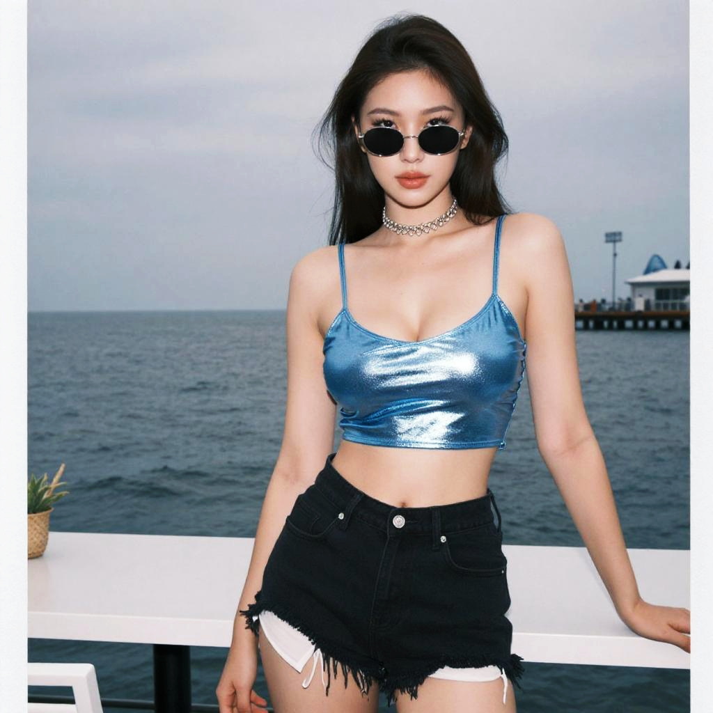 Photograph of an Asian woman with long black hair, wearing a shiny blue crop top, black denim shorts, and sunglasses, standing by a seaside railing