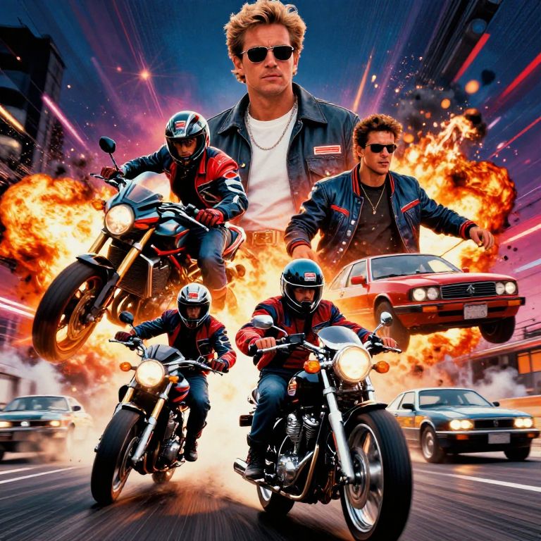 90s action movie posters illustrating high-speed chases with motorcycles and cars, fiery explosions, smoky battlefields, heroic figures in signature 90s fashion gear, layered compositions with multiple characters, and gritty textures paired with striking neon-tinted backdrops.