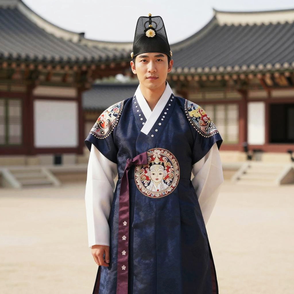 Handsome man in Korean royal attire, elegant and regal pose in a traditional palace courtyard, soft diffuse daylight, intricate embroidery, baroque art style inspiration