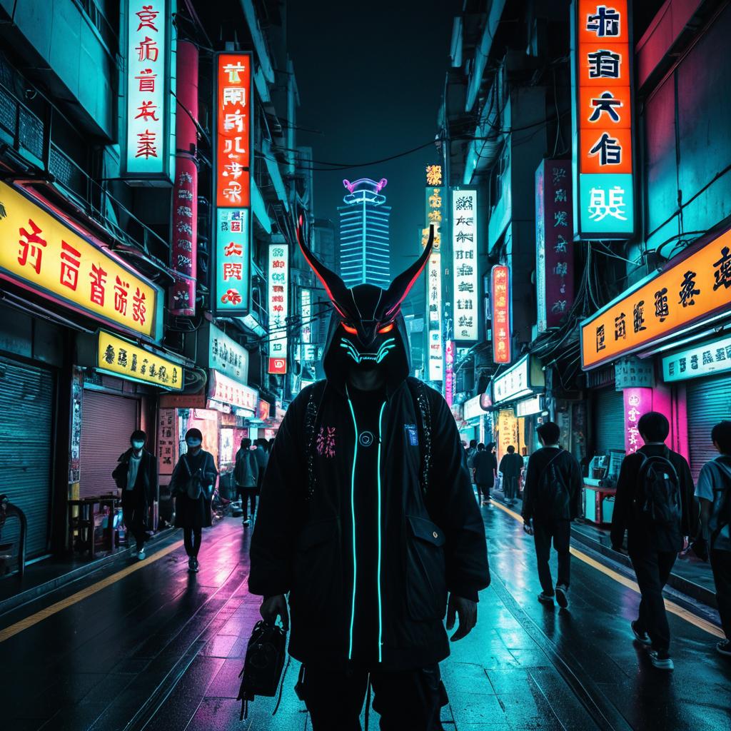 Cyberpunk Yokai in Neon-Lit Taipei Street