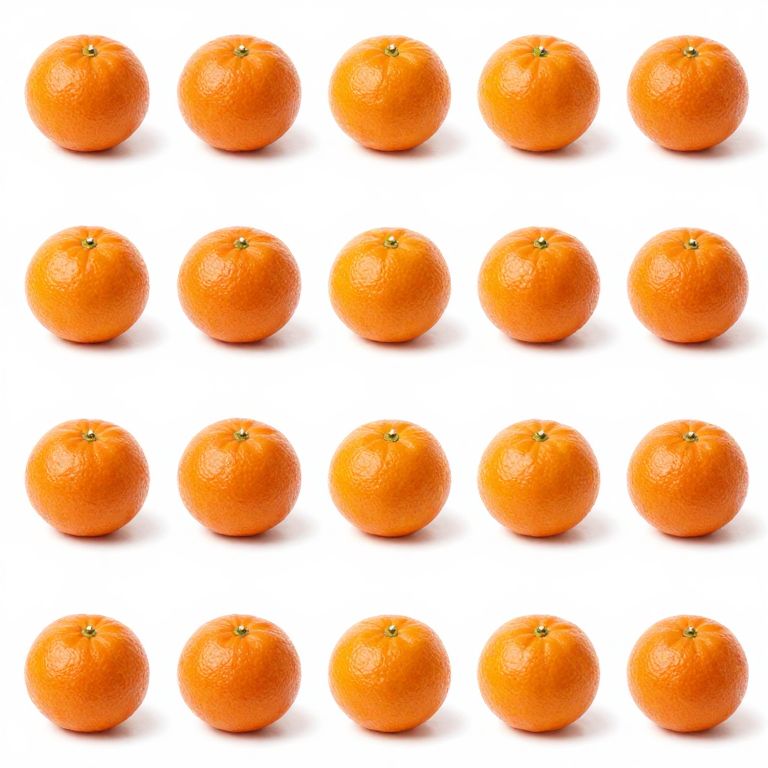 Vibrant orange mandarins arranged in a grid pattern, each with a small stem, evenly spaced and isolated against a pristine white background, creating a striking and uniform photographic composition.
