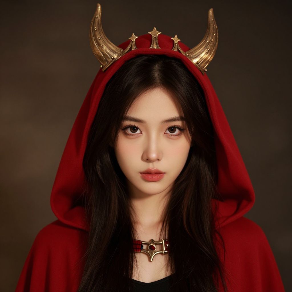 Photograph of an East Asian woman with long black hair, wearing a red hooded cloak with gold horned crown, and black top, against a