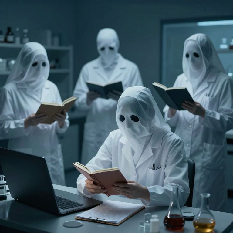 Photograph of five individuals in a dimly lit laboratory, wearing white hazmat suits with black eye holes, reminiscent of ghost masks. They are intently reading books, standing around a white lab table with a laptop, notebook, and glass beakers of yellow liquid. The background features shelves with various bottles and a door. The scene is illuminated with a cool blue light, creating a mysterious and eerie atmosphere. The subjects' expressions are obscured by their masks, adding to the enigmatic feel.