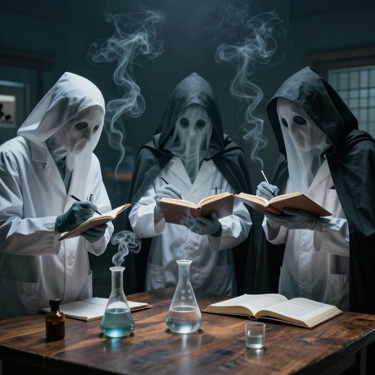 Ghosts in lab coats conduct impossible experiments on living shadows, recording their findings in notebooks that appear and vanish at will.