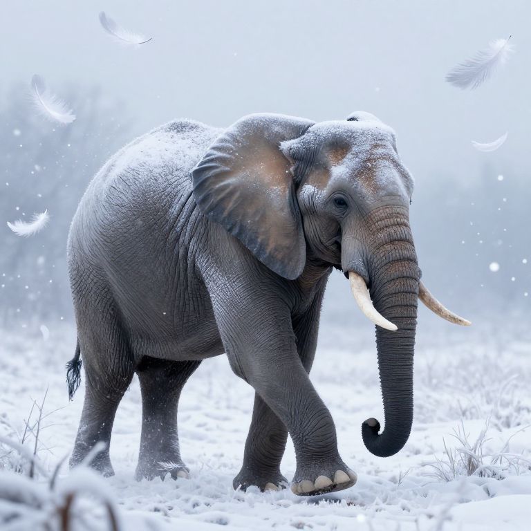 A majestic elephant cloaked in a mane of frosty fur strides through a surreal winter landscape where delicate feathers drift like snowflakes, defying gravity and creating an otherworldly, dreamlike atmosphere.