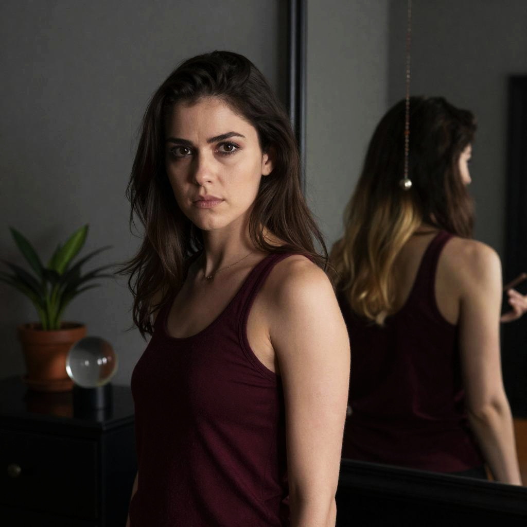 Close-up of a distressed young woman with disheveled brown hair, intense expression, and clenched fist. She leans forward over a red and grey surface. A person in dark clothing is partially visible behind her. Brick wall in the background.