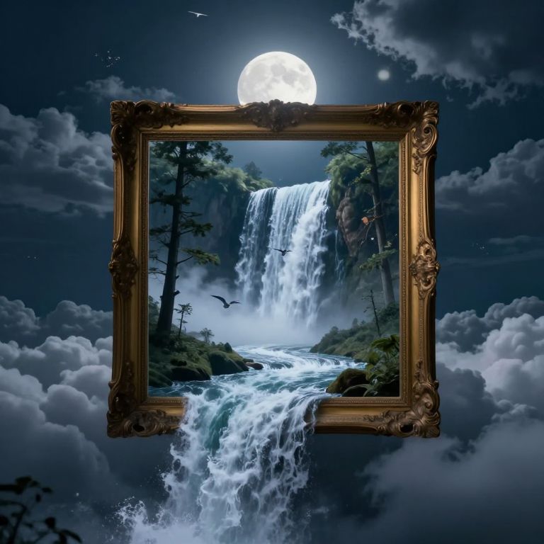A digital artwork features an ornate, gold-framed painting centered in a night sky with a full moon. The painting depicts a lush, cascading waterfall surrounded by dark, towering trees, with swirling white water at the bottom. The frame's intricate carvings contrast sharply with the vivid, natural scene. Dark, fluffy clouds surround the moon and frame, enhancing the mystical atmosphere. The moonlight illuminates the waterfall, creating a luminous effect. The overall composition blends realistic natural elements with surreal, dream-like framing, evoking a sense of fantasy and enchantment.