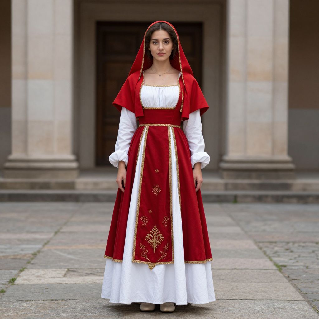 Photograph of a young woman with dark hair, wearing a red medieval-style dress with white blouse, gold embroidery, and a red veil, standing in