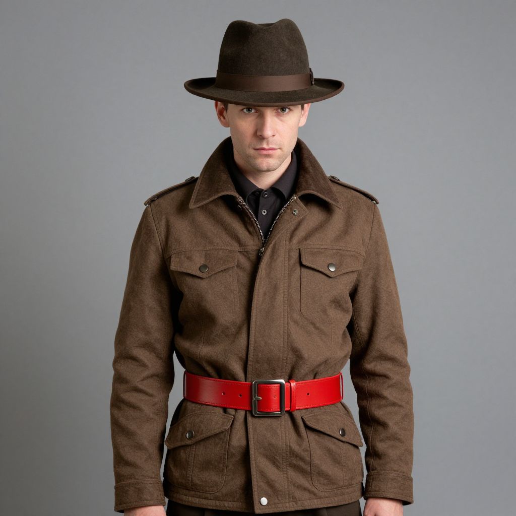"Man Creative Costume, man in a brown jacket and hat with a red belt"