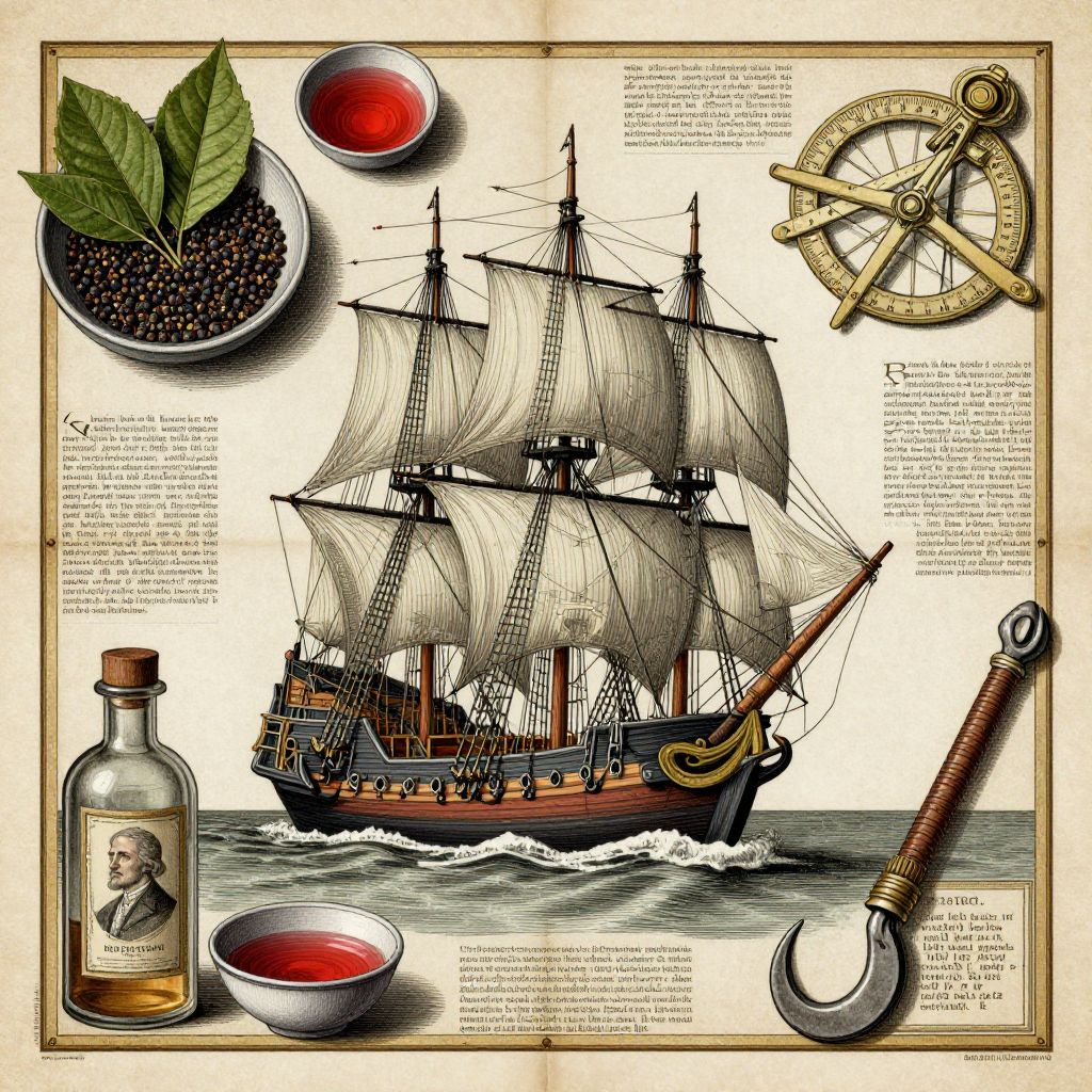 The image presents a detailed, vintage-style illustration that combines elements of nautical cartography, botany, and alchemy. At the center is a large, intricately drawn galleon, reminiscent of 18th-century ships, with three masts and full sails unfurled, suggesting a journey across the ocean. Surrounding the ship are various objects, each with a distinct purpose and historical significance. To the left, a bowl filled with green leaves and black seeds, possibly representing spices like aleppo pepper, is placed near a bottle with a portrait of a man, hinting at the use of these ingredients in maritime voyages. A small bowl of red liquid, likely white wine vinegar, sits nearby, indicating the use of such substances in preserving food or as a condiment. A sextant, an instrument for navigation, is positioned to the right of the ship, emphasizing the theme of exploration and measurement. A hook hand, a symbol often associated with Freemasonry and the Illuminati, adds a layer of esoteric intrigue to the scene. The background is a textured parchment, adorned with various texts and diagrams, contributing to the overall historical and mystical atmosphere. The composition is balanced, with objects arranged in a way that guides the viewer's eye from the ship to the surrounding elements, creating a cohesive and visually engaging narrative.