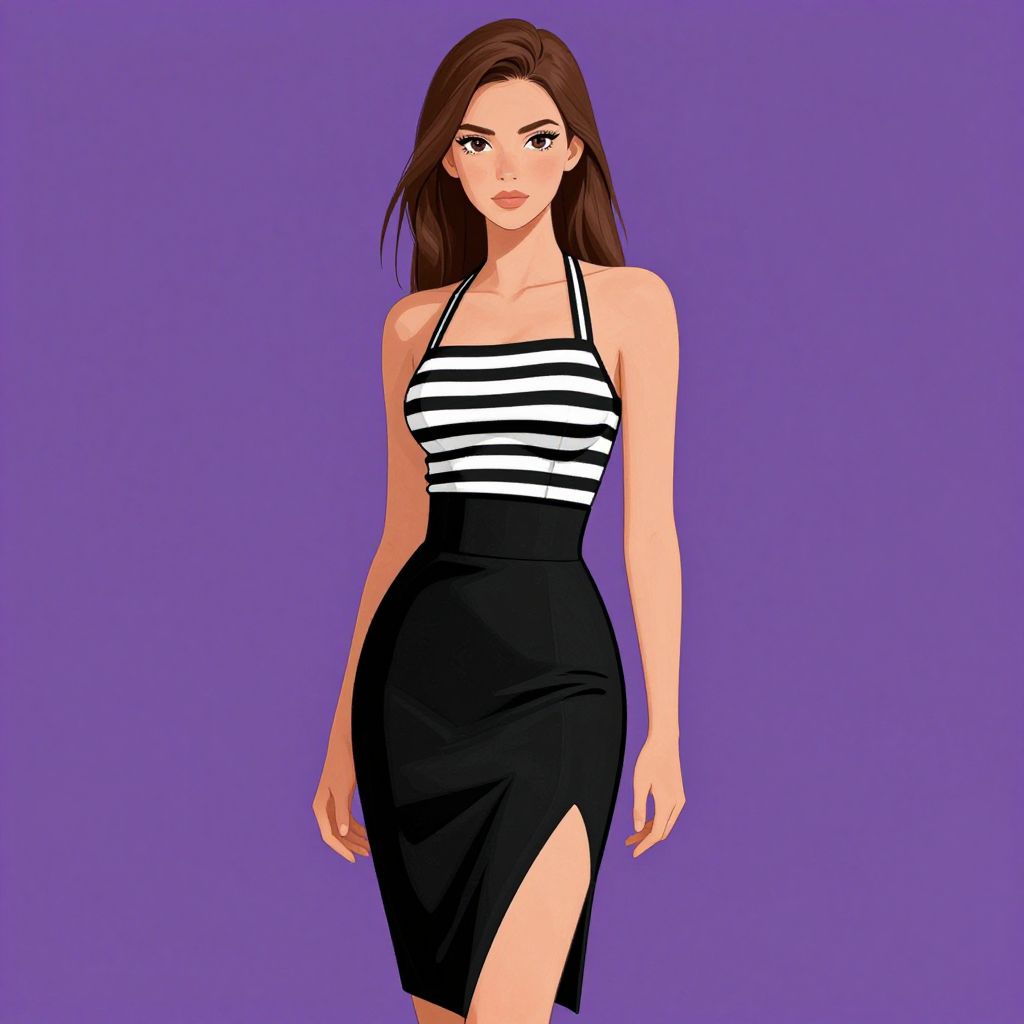Digital drawing of a slender, fair-skinned woman with long brown hair. She's wearing a black and white striped halter top and a high-waisted, black pencil skirt with a side slit. The background is solid purple. Her expression is neutral, and she stands with a relaxed, slightly forward-leaning posture. The art style is crisp and modern, with bold colors and clean lines.