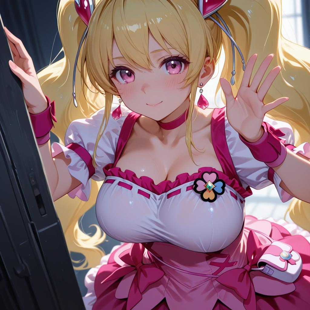 Cure peach, precure, 1girl, pink eyes, blonde hair, long hair, heart hair ornament, twintails, large breasts, pink choker, pink bow, earrings, heart earrings, magical girl, magical girl, wrist cuffs, pink wrist cuffs, by artist mu46016419, dark_illustrious