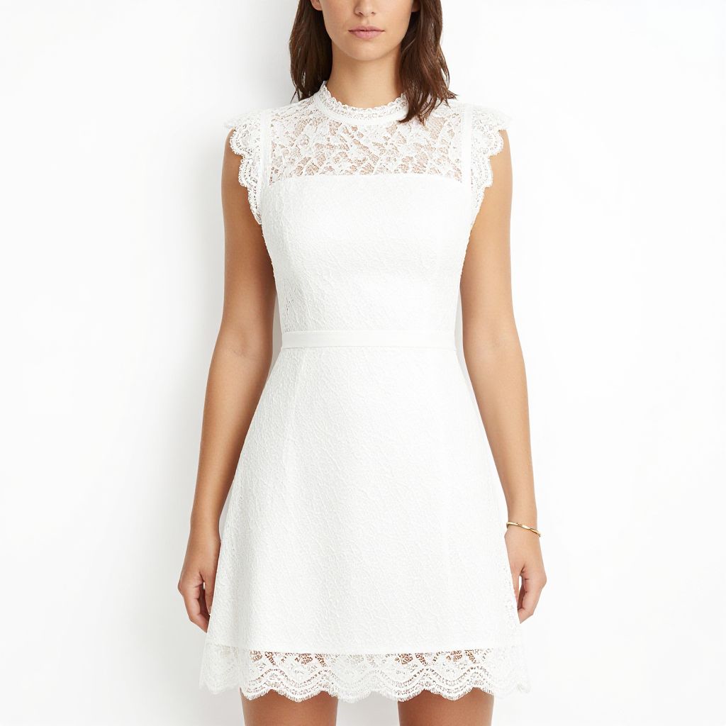 "Woman, modern romantic, white lace dress, sleeveless, high neckline, subtle frill detail on arm openings, fitted bodice with darts, scalloped hemline, A-line knee-length skirt with see-through lace patterns, simple gold bangle, white background.. Sexy. Pretty face and beаutiful eyes. Big breasts."
