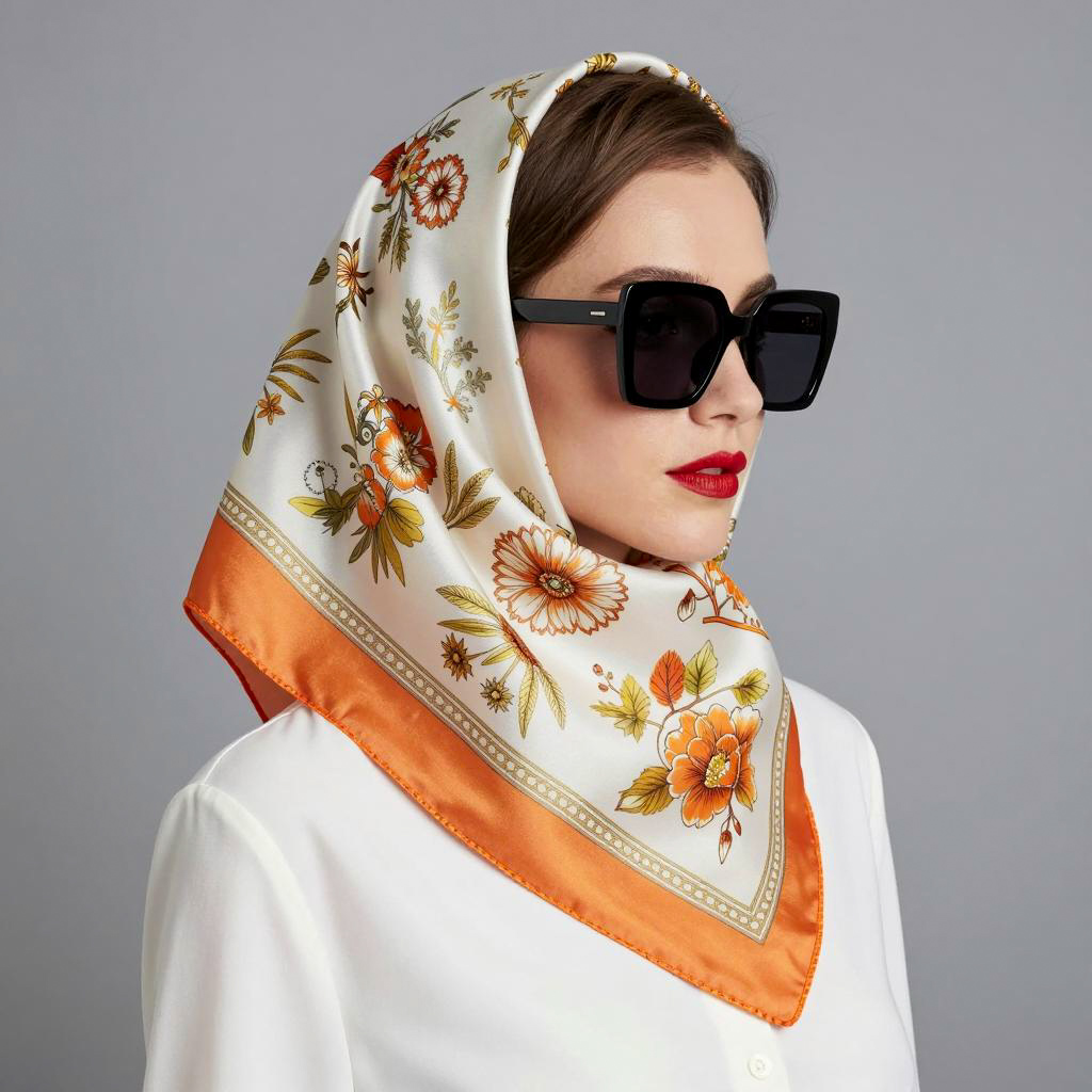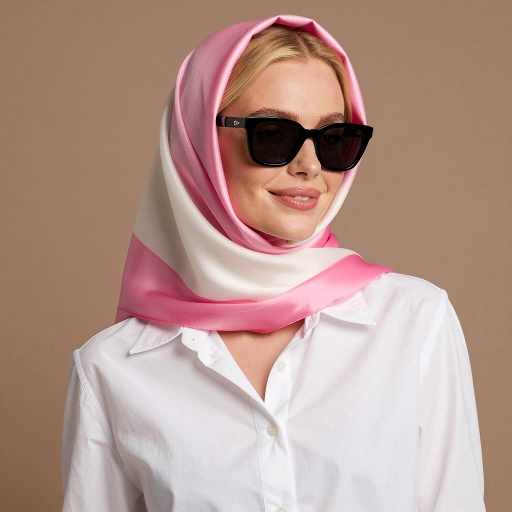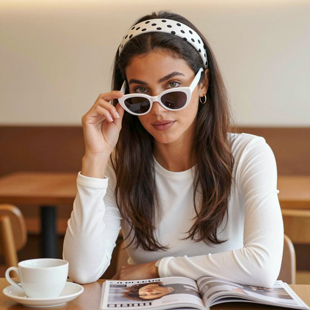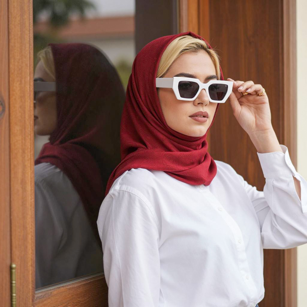 Blonde woman with white sunglasses and red-patterned hijab, white long-sleeve blouse, leaning against wooden window frame. Reflection in glass. Hand adjusting sunglasses. Light skin, confident expression. White, geometric sunglasses. Gold ring on left hand. Textured wood background. Casual, stylish pose.