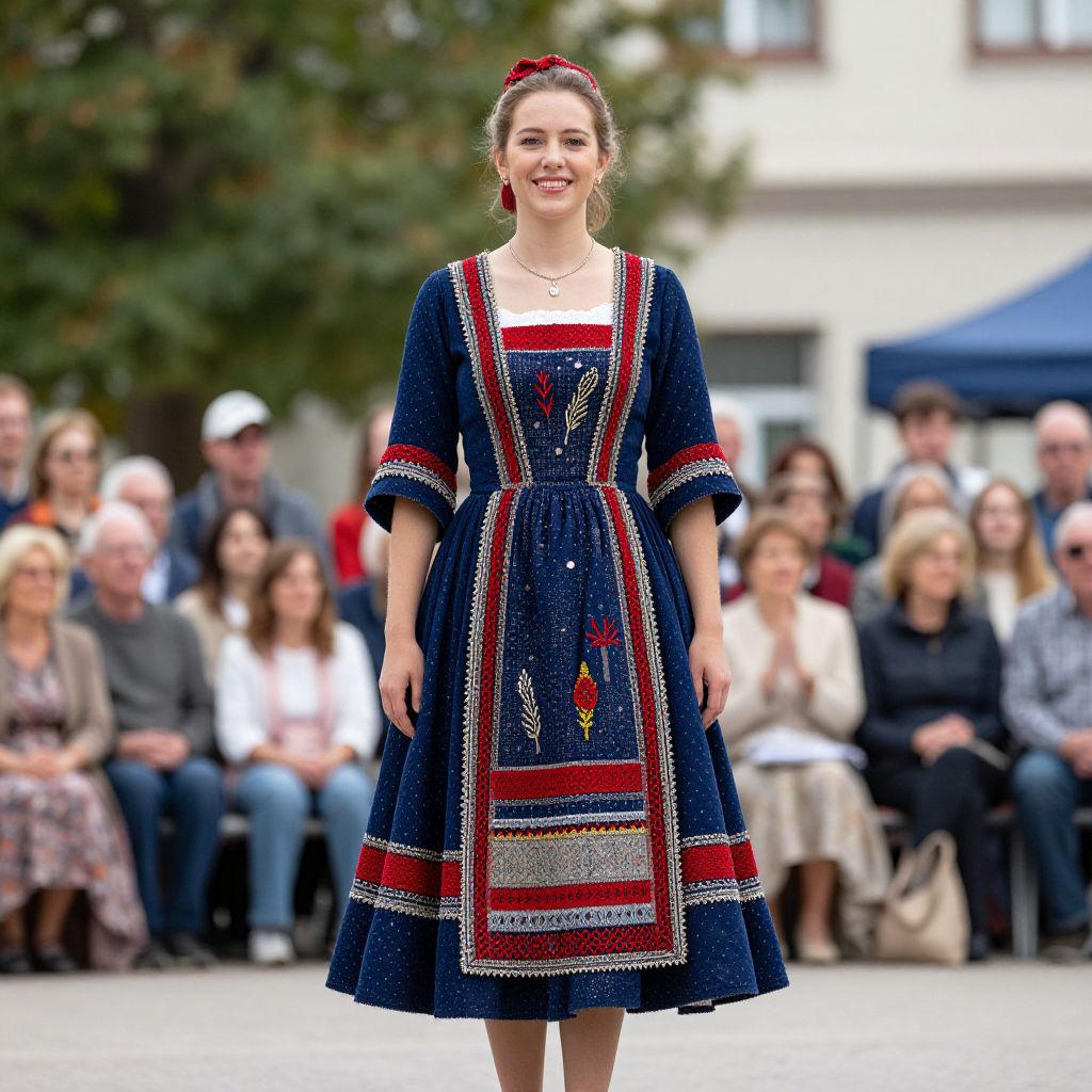 Photograph of a smiling young woman with light skin and brown hair in a red headband, wearing a knee-length, navy blue embroidered dress with red, white, and yellow geometric patterns. The dress has long sleeves and a square neckline. She stands in the center of an outdoor event with a blurred crowd of onlookers in the background, dressed in casual attire. The background includes green trees and a blue tent. The image has vibrant colors and a shallow depth of field, focusing on the woman while the background is softly out of focus.