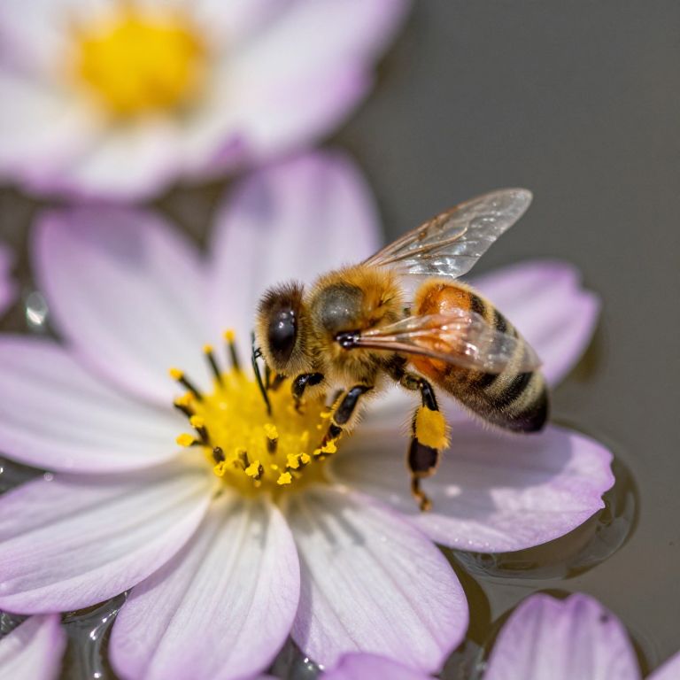 A close-up photograph of a honeybee with translucent wings and fuzzy orange and black striped body, feeding on a pale pink daisy with a bright yellow center. The bee's legs grip the flower's petals, which have delicate, slightly translucent textures. The background is blurred, featuring more similar daisies in soft focus, creating a sense of depth. The colors are vibrant, with the bee's orange and black contrasting against the flower's pale pink and yellow. The image showcases intricate details of the bee's body and the flower's petals.
