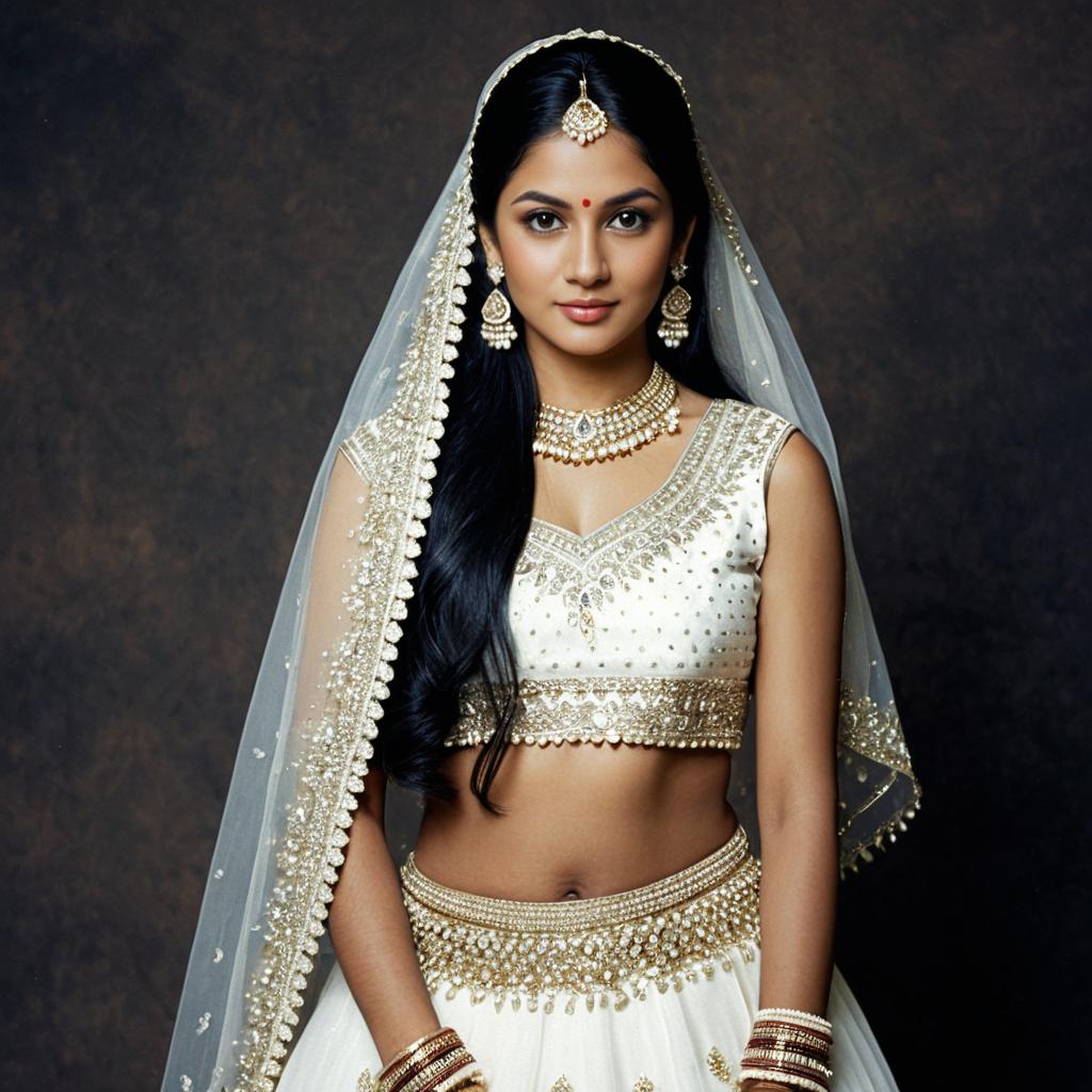 Wedding outfit indian bride,1girl, solo, jewelry, black hair, bracelet, earrings, long hair, realistic, midriff, crop top, veil, skirt