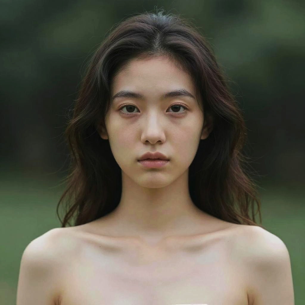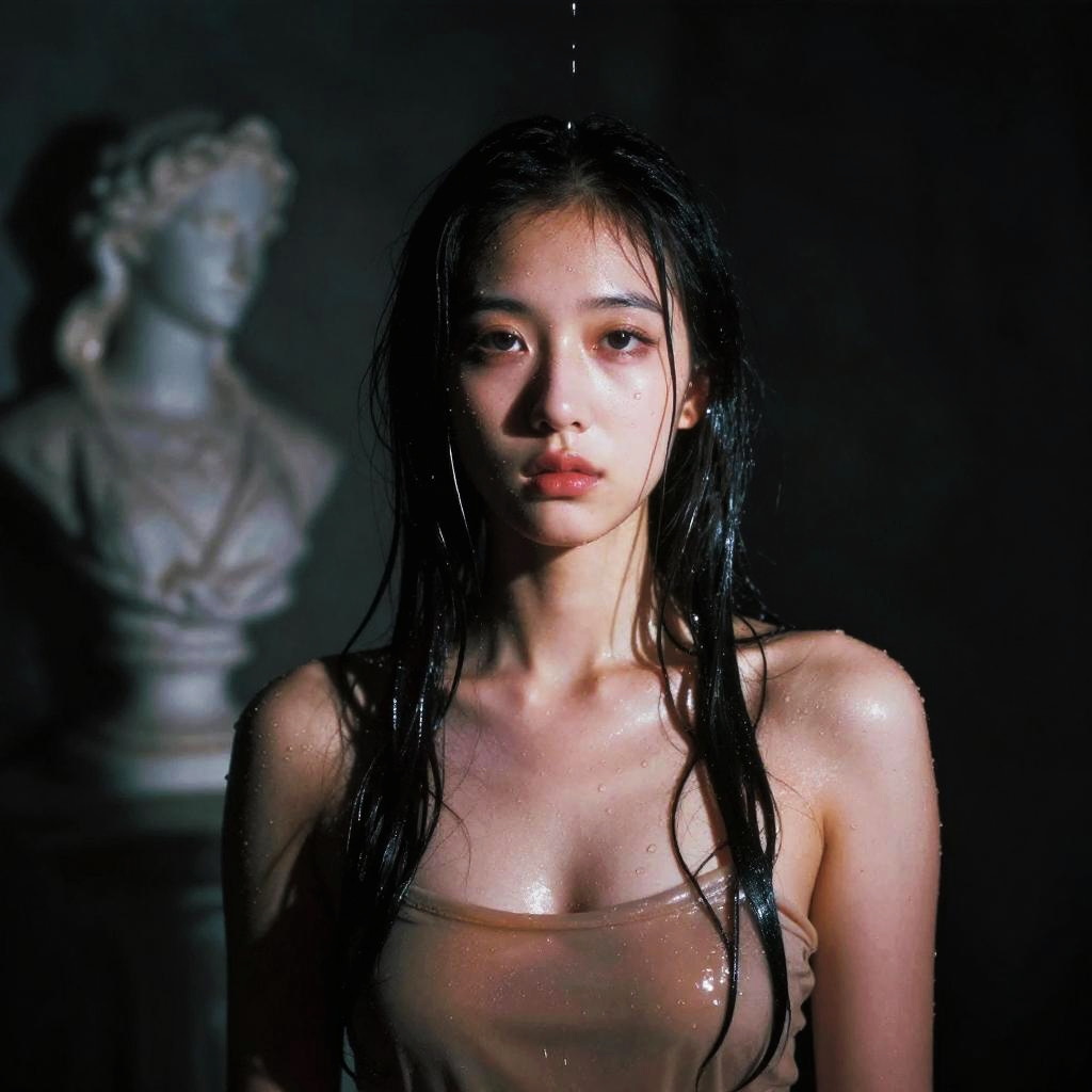 Photorealistic portrait of an Asian woman with long wet hair and water droplets on her skin, wearing a wet nude-colored top. The composition features gothic dark and moody tones with neon-lit pop art style and softbox lighting. A surreal classical bust sculpture blurred in the background, enhancing the dramatic and artistic feel of the image.