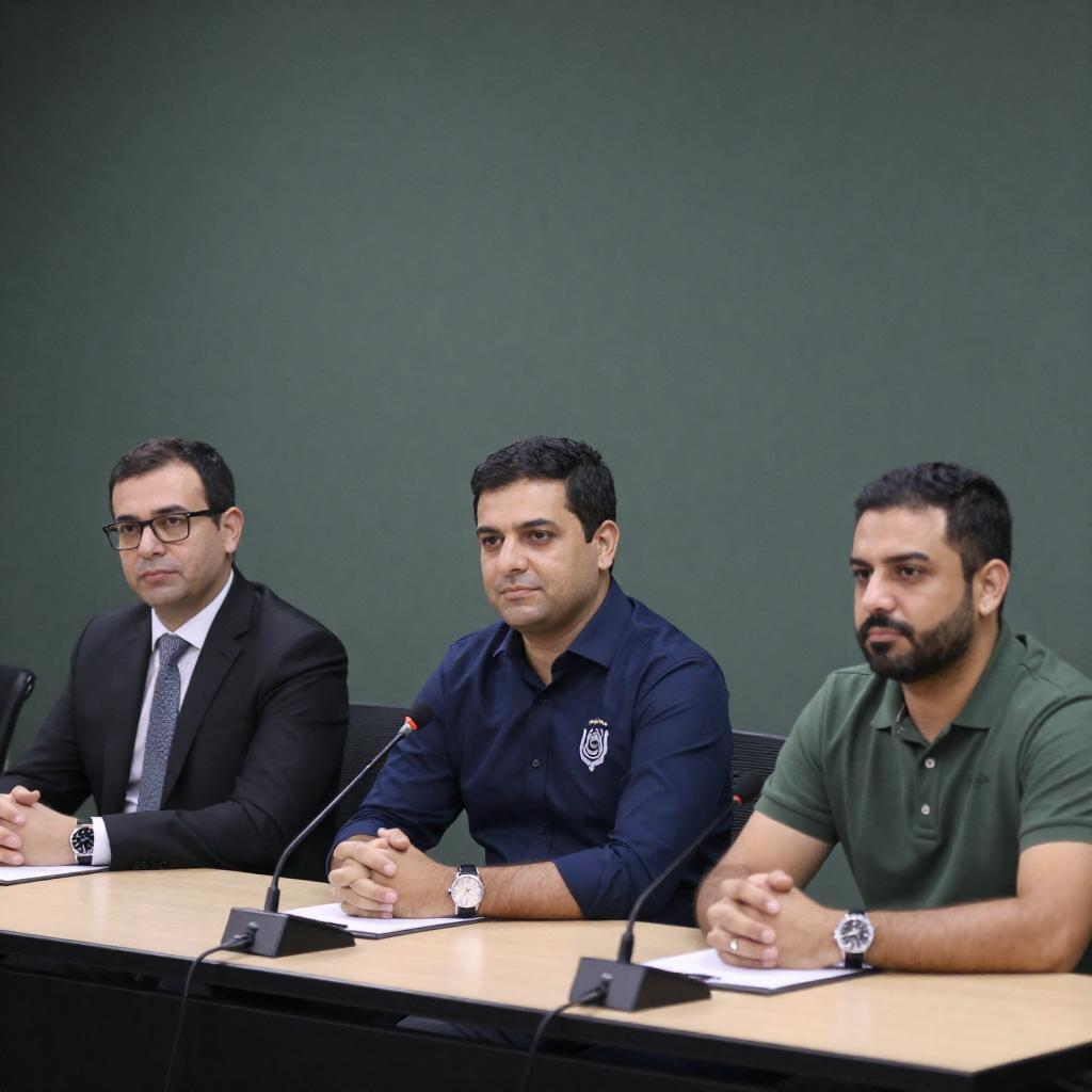 Photograph of a wooden courtroom with men in formal black and white suits seated on tiered benches. The men, mostly with dark hair and mustaches, sit in rows, some standing, others leaning forward. The background features wooden paneling and a carpeted staircase. The lighting is bright, highlighting the wood ures and formal attire.