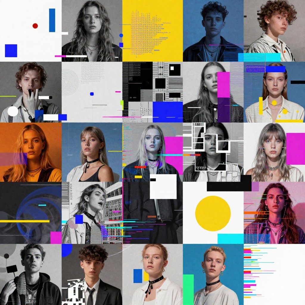 Image mixer tool visualization, abstract digital collage of diverse pictures merging smoothly, bright contrasting hues, geometric shapes, glitch art aesthetics, modern technology vibes, creative visual effect, ultra high resolution