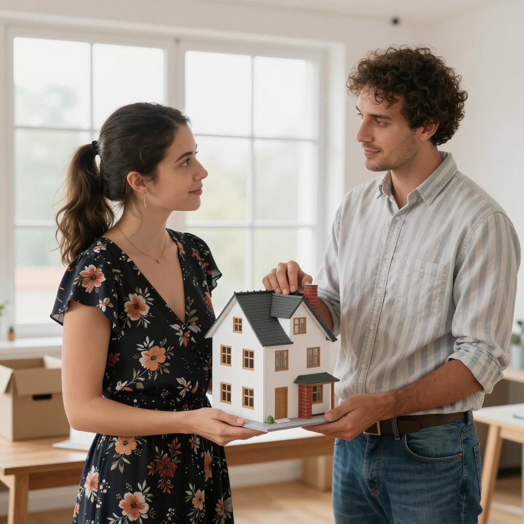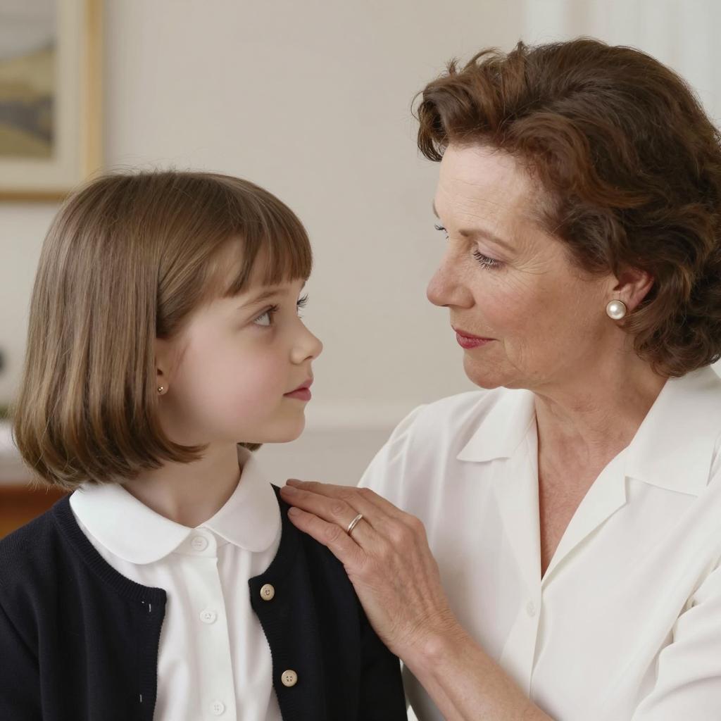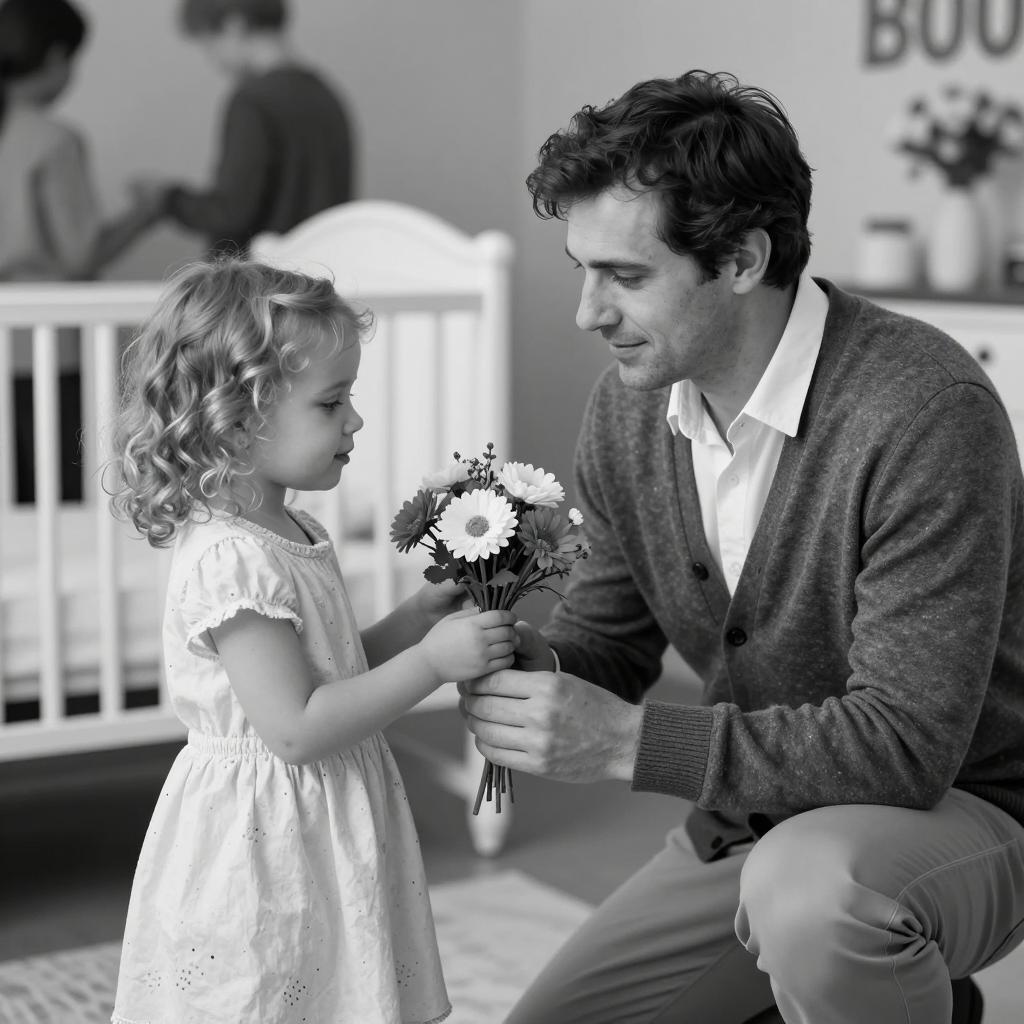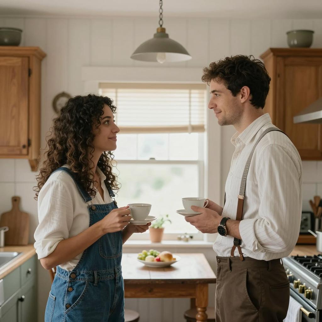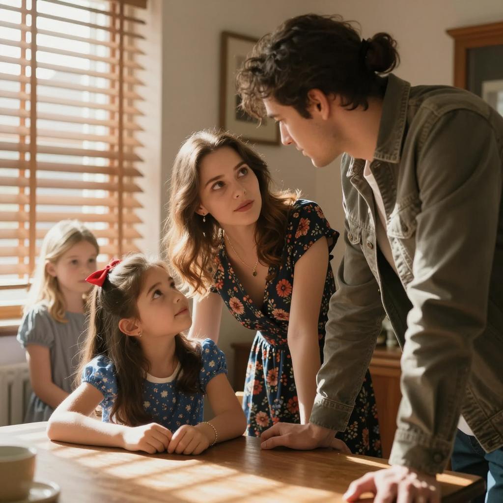 Man with short dark hair, light beard, wearing striped shirt and dark vest, looks at young girl with long brown hair, wearing red plaid dress and gray cardigan, holding a large glass jar. Background is a blurry kitchen with utensils. Both sit close together, man leans forward. Three people in total. Man has focused expression, girl looks at him.
